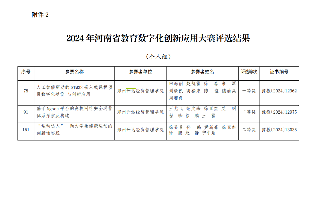近日,河南省教育厅下发了《关于公布2024年河南省教育数字化创新应用大赛评选结果的通知》(教科技〔2024〕290号),公布了2024年河南省教育数字化创新应用大赛获奖名单。我校四项成果获奖,其中团体组二等奖1项,个人组一等奖1项,二等奖2项。