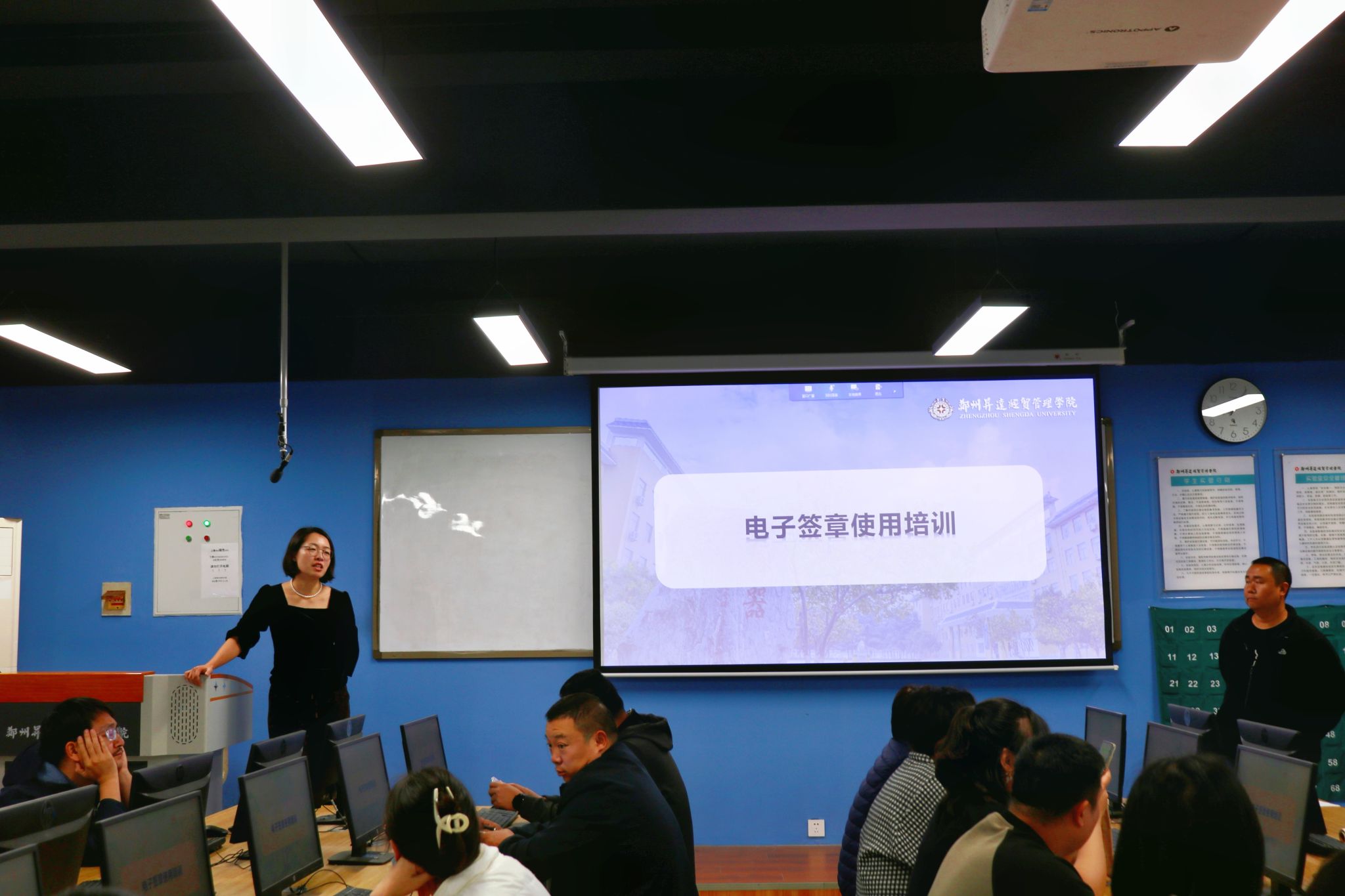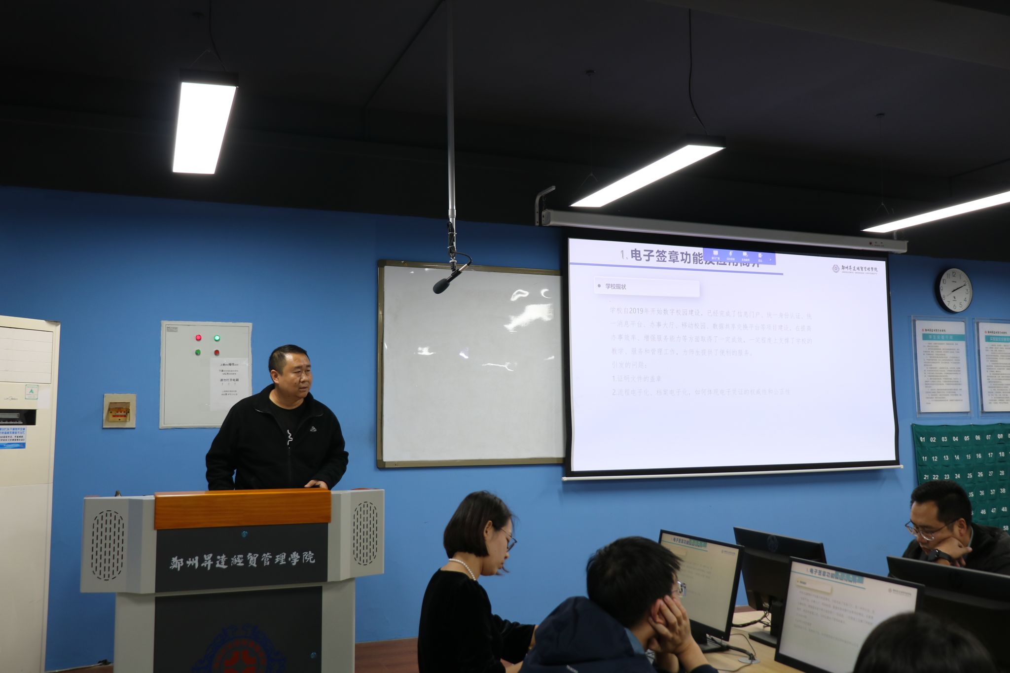 信息化科科长徐鹏从电子签章功能和发文、签呈模版签章使用以及常见问题三个方面进行了详细讲解。重点实操演示了操作流程中的关键环节,并与现场老师互动交流,答疑解惑,帮助大家熟悉电子签章的操作。