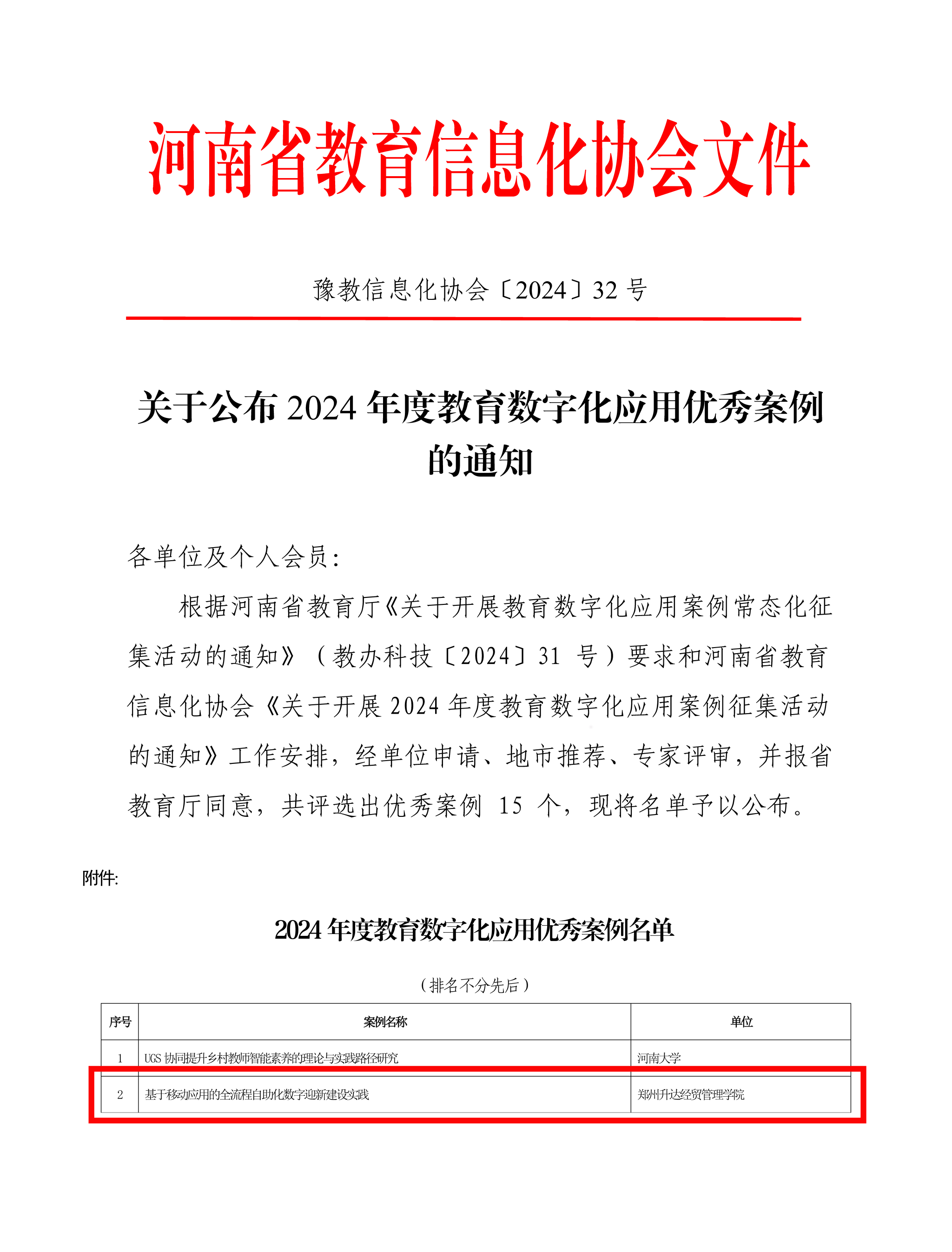近日,河南省教育信息化协会公布了《关于公布2024年度教育数字化应用优秀案例的通知》入选名单。本次案例评选活动,是依据河南省教育厅发布的《关于开展教育数字化应用案例常态化征集的通知》(教办科技〔2024〕31号)以及河南省教育信息化协会《关于开展2024年度教育数字化应用案例征集活动的通知》的相关要求与工作部署进行的。本次评选覆盖全省教育系统,经单位申请、地市推荐、专家评审,并报省教育厅同意,共评选出优秀案例15个,我校申报的《基于移动应用的全流程自助化数字迎新建设实践》案例入选优秀案例。