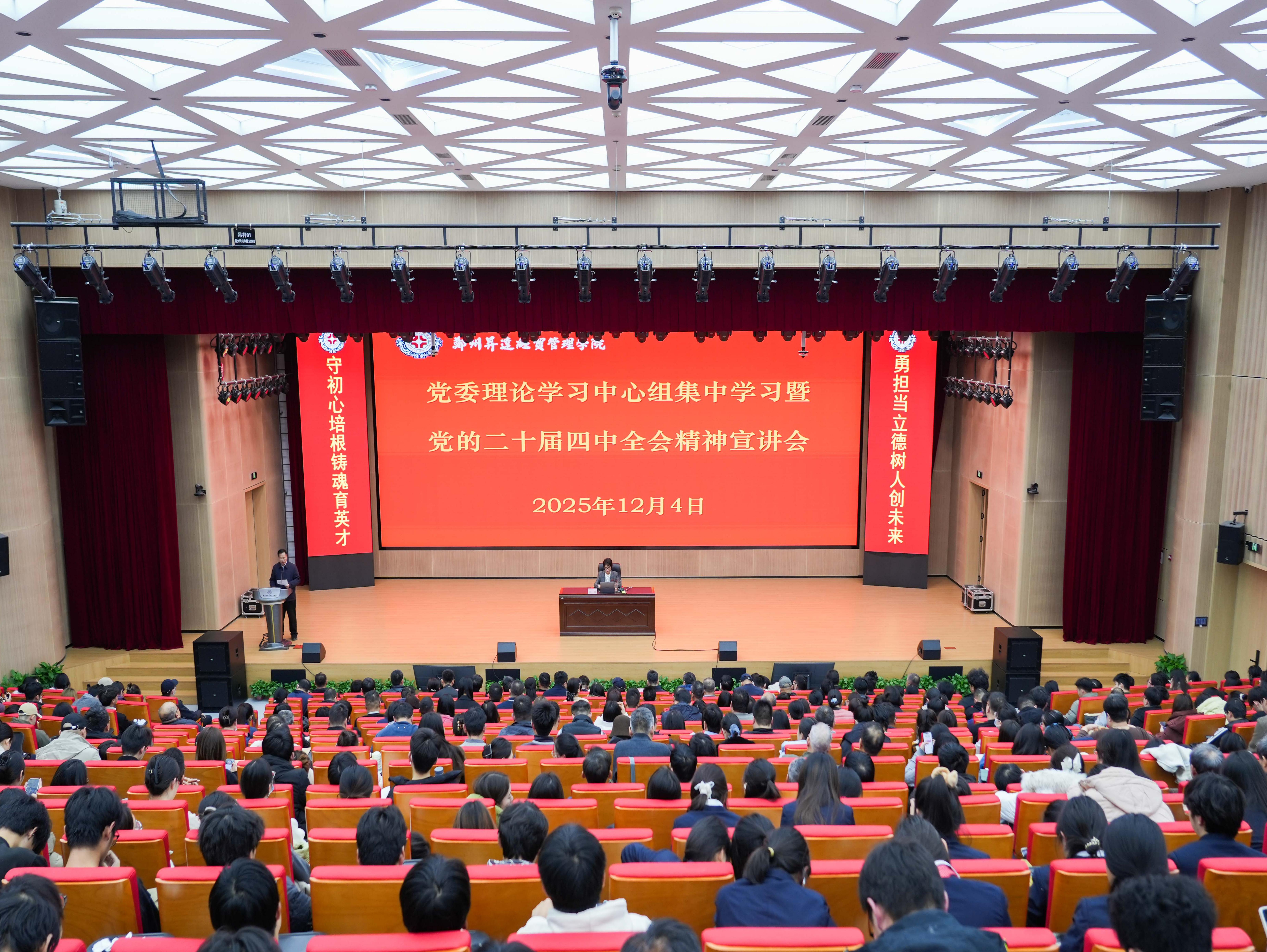为深入学习领会党的二十届四中全会精神,认真落实中央和省委部署要求,引导全校师生切实把思想和行动统一到全会精神上来,按照工作部署,12月4日下午,在新图书馆第三报告厅召开校党委理论学习中心组(扩大)会,校党委副书记、校长张欣为师生宣讲党的二十届四中全会精神。董事长王新奇博士,校党委副书记、副校长张金安,校党委委员、副校长张其武,校党委委员、登封校区党工委书记沈定军等校领导,校党委理论学习中心组成员,科级及以上领导干部,马克思主义学院教师和各学院师生代表共500余人参加学习。会议由张金安主持。
