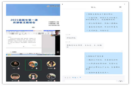 首先,在新生报到初期,辅导员通过组建网络云平台(QQ群、微信群)对新生开展了反邪教方针政策宣传,并结合龙湖镇当地情况提醒同学们入学后要对邪教提高警惕、加强防范;其次,在外语学院党委统一部署下,21级新生各班开展了双防安全主题教育“云班会”。辅导员重点向同学们讲解了邪教的本质和危害,提高了新生对邪教的认知,并通过实际案例的分析来警醒同学们防范邪教渗透;在新生网络报到期间,学院通过印发学生宗教信仰信息统计表对21级新生进行宗教信仰摸排,了解学生的宗教信仰情况,对有宗教信仰的同学进行重点关注,防止学生被非法传教人员带入歧途。最后,在军训期间,辅导员老师深入到各宿舍开展反邪宣传教育,向新生阐明邪教的危害及预防措施,引导新生认清邪教真面目。