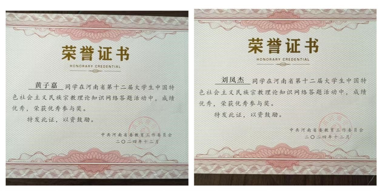 为帮助学生更加深入了解中国特色社会主义民族宗教理论,10月28日至11月3日,中国河南省委教育工委联合河南省教育厅举办河南省第十二届大学生中国特色社会主义民族宗教理论知识网络答题活动,2023级数学与应用数学专业本科一班的黄子嘉以及2024级数学与应用数学专业本科一班的刘凤杰成绩优异,喜获优秀参与奖。