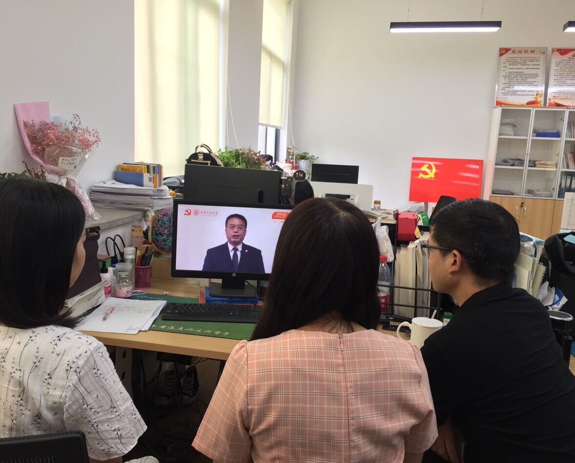 以庆祝建党99周年为契机,以“牢记初心使命、争当出彩先锋”为主题,外国语学院学生第三党支部全体党员同志于2020年7月1日上午9点在教一号楼306办公室采用线上线下相结合的方式集体观看了“高校党组织战‘疫’示范微课‘七一’专题”,并进行了讨论与学习,支部全体党员参会。