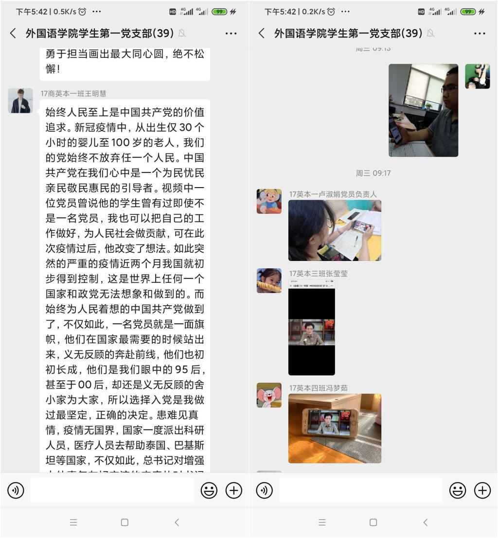 七月一日当天,在支部书记祁胜利的带领下,支部开展了“七一”主题党日活动,组织全体党员网上观看“高校党组织战“疫”示范微党课七一专题”视频。所有党员上传观看照片,并在观看视频后在党支部微信群组织全体党员进行交流讨论,畅谈观后感。