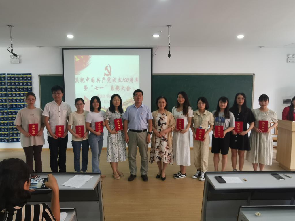 石皓召书记和外国语学院院长张梦教授为10名“优秀党员”颁奖并合影留念,全体师生党员以热烈的掌声对获奖的优秀党员同志表示祝贺。