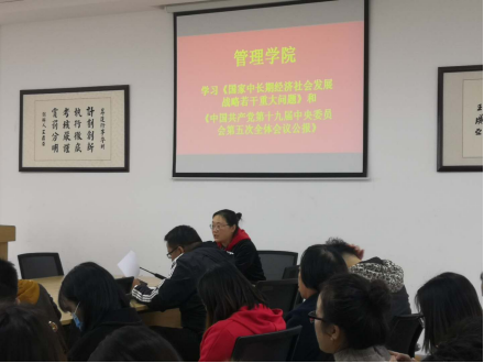 为深入学习宣传贯彻习近平新时代中国特色社会主义思想,紧跟党的思想与精神方向,全面深化党的思想引领,11月5日14:40,管理学院于2号教学楼209会议室组织学习《习近平:国家中长期经济社会发展战略若干重大问题》和《中国共产党第十九届中央委员会第五次全体会议公报》——暨青春时政主题教育活动。此次会议由管理学院党总支书记张小雁主持,学院全体教师参加活动。