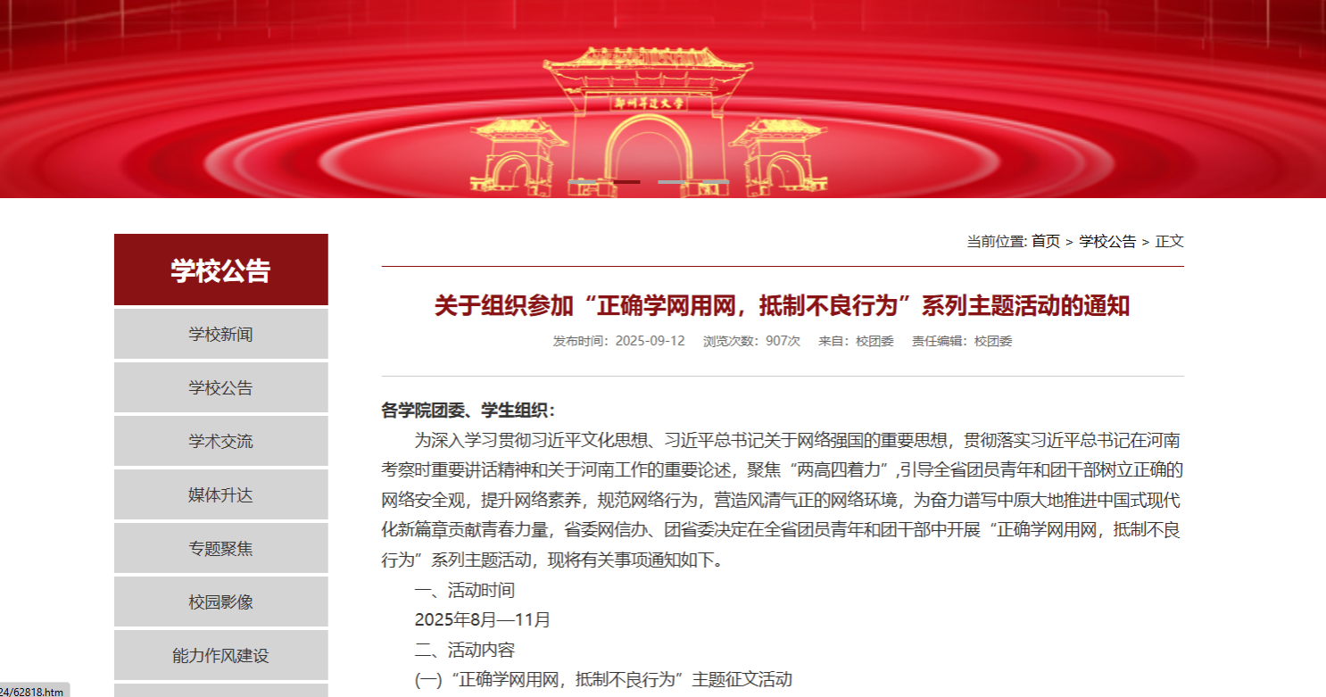 为深入学习宣传贯彻习近平总书记关于网络强国的重要思想,按照省委教育工委、省教育厅工作安排,我校于9月15日至21日,组织开展了2025年国家网络安全宣传周河南省校园日系列活动。活动以"网络安全为人民 网络安全靠人民——以高水平安全守护高质量发展"为主题,通过多种形式深入开展网络安全宣传教育,全面提升师生网络安全意识和防护能力。