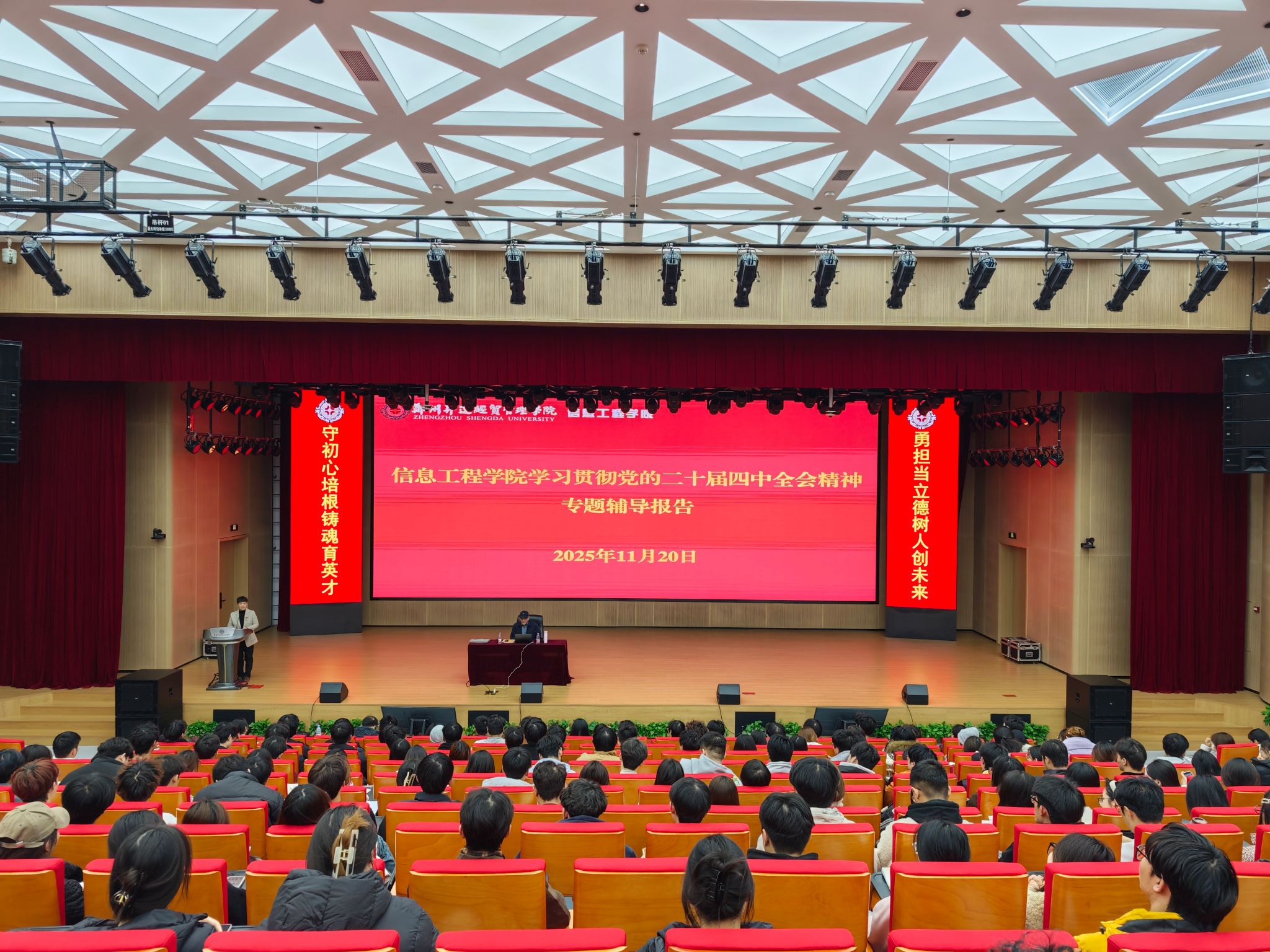 为深入学习贯彻党的二十届四中全会精神,引导青年学子深刻领悟全会核心要义、强化责任担当,2025年11月20日,信息工程学院党委在新图书馆三楼报告厅举办专题辅导报告。本次报告特邀我校马克思主义学院程明欣院长主讲,学院第二十二期入党积极分子、党员发展对象、团学骨干及学生党员代表共400余人现场参会,共同接受思想洗礼与精神赋能。