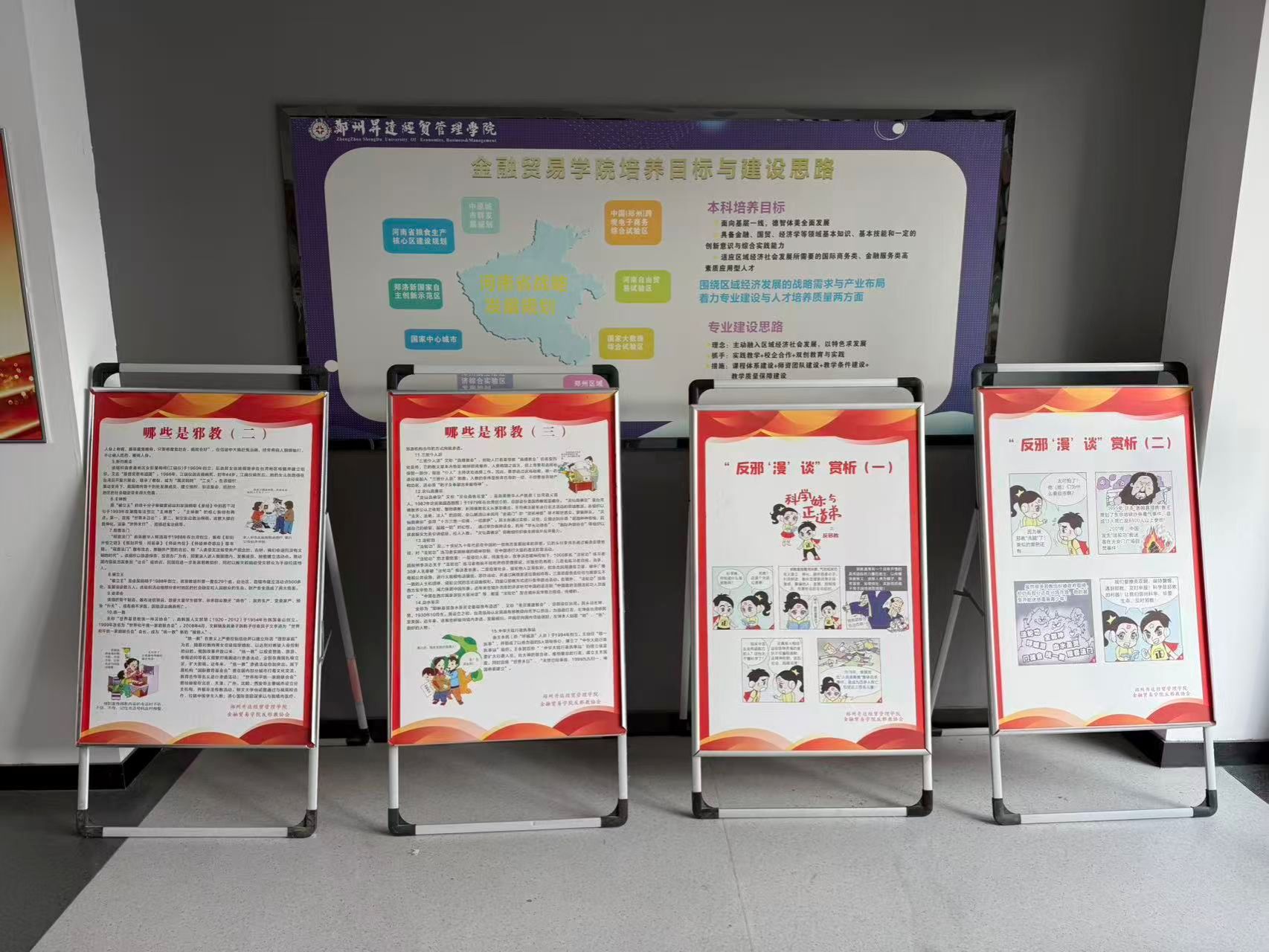 为让宣传教育触手可及,学院反邪教协会在学院打造 “立体宣传阵地”。教学楼入口红色宣传横幅醒目悬挂,与校园绿植相映成景,形成强烈的视觉引导;教学楼大厅内,主题展板整齐陈列,通过真实图片、数据对比、漫画解读等通俗形式,将专业法律知识与反邪教常识具象化、易懂化。反邪教协会志愿者发放《反邪教科普读本》共计 100 余份,现场解答 “邪教与宗教的区别”“如何举报邪教活动” 等疑问,让 “被动观看” 变为 “主动学习”,推动宣传内容入脑入心。