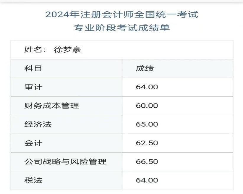 考研复试结果出来后,徐梦豪同学在2024年4月重新全身心投入到注册会计师考试科目的学习中。会计学院为备考注册会计师的同学建立了“注会考试打卡群”,徐梦豪同学与群内众多怀揣注会梦的同学们一起打卡学习,相互激励、共同进步。最终,他以优异的成绩一次性通过了2024年注册会计师考试专业阶段全部六科考试,并顺利通过了税务师考试五科中的四科。