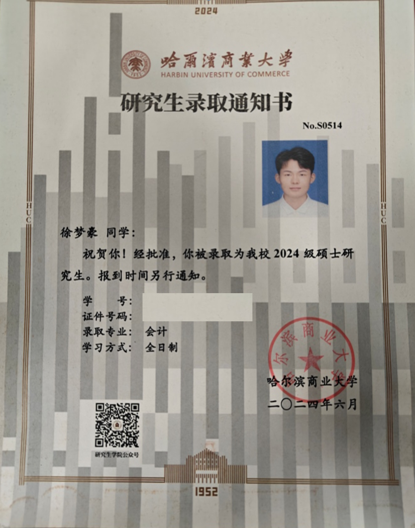 在大三上学期,徐梦豪同学在学长的帮助下规划了自己的考研之路。备考研究生期间,徐梦豪同学与宿舍的三个同学一起努力备考,相互鼓励、相互监督。然而,在距离考研大约40天的时候,他不幸感染了甲流和支原体,生病期间无法学习让他倍感煎熬。但他迅速调整心态,积极养病,最终凭借顽强的毅力,成功被哈尔滨商业大学会计专业录取为硕士研究生。
