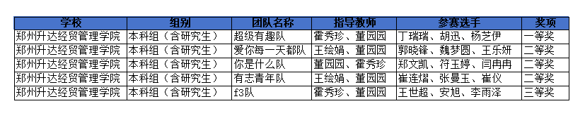我校商学院学生丁瑞瑞、胡迅、杨芝伊、郭晓锋、魏梦圆、王乐妍、郑文凯、符玉婷、闫冉冉、崔连熠、张曼玉、崔仪、王世超、安旭、李雨泽组成的五个团队参加了此次总决赛。经过激烈角逐,我校学子共荣获全国总决赛一等奖1项、二等奖3项、三等奖1项。通过参加此次竞赛,参赛学生提升了专业技能、实践能力和综合素养。