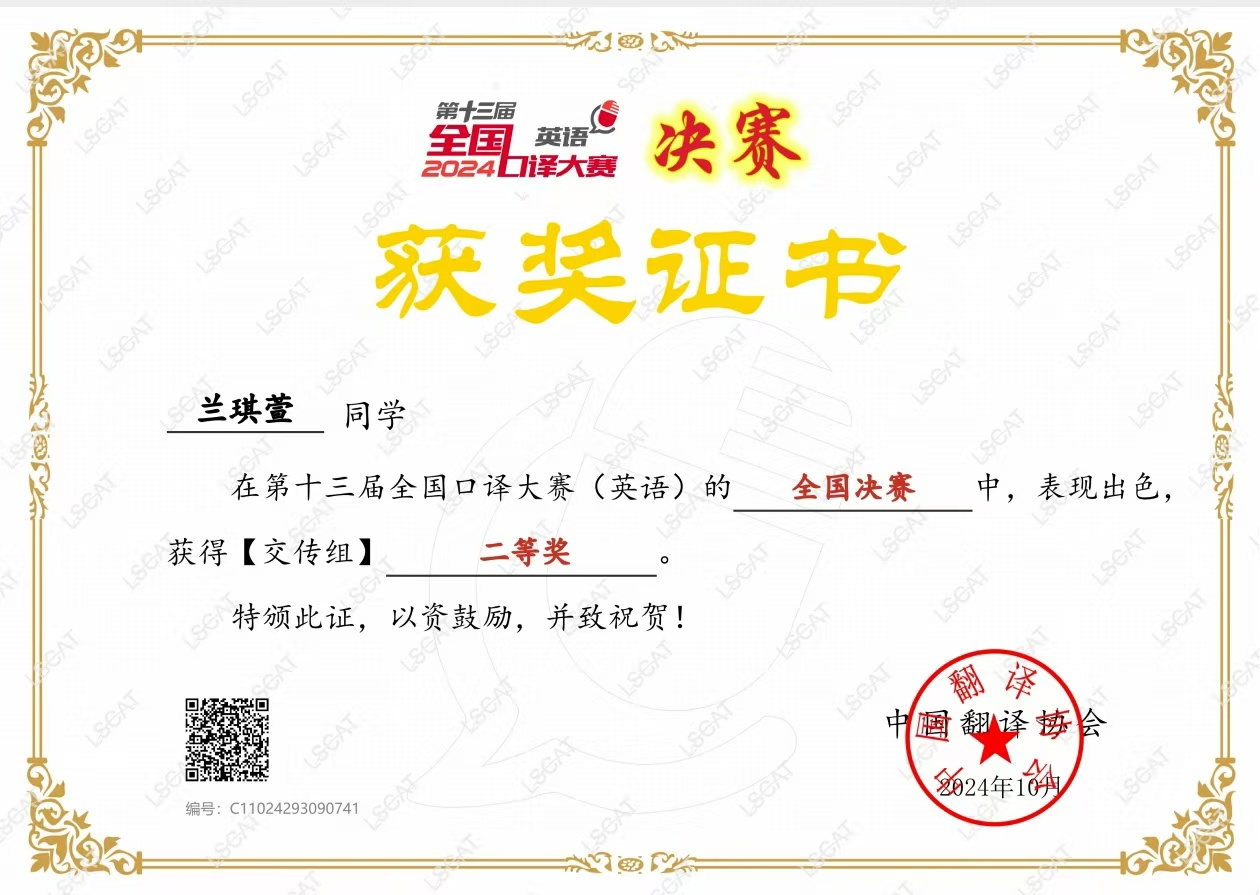 在刚揭晓的第十三届全国口译大赛(13th ACIC)全国决赛结果中,我校外国语学院2021级翻译专业本科2班兰琪萱同学荣获二等奖。