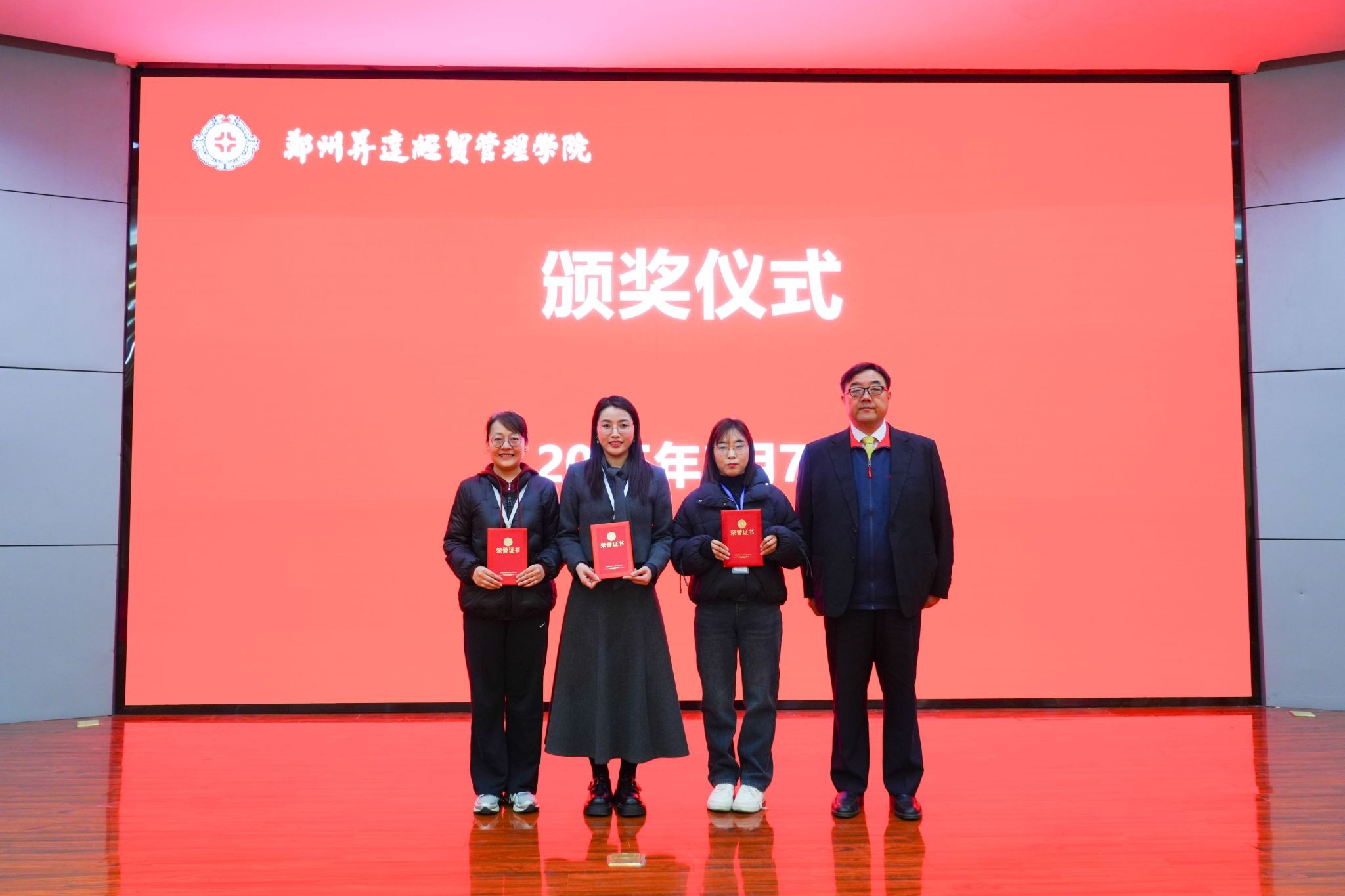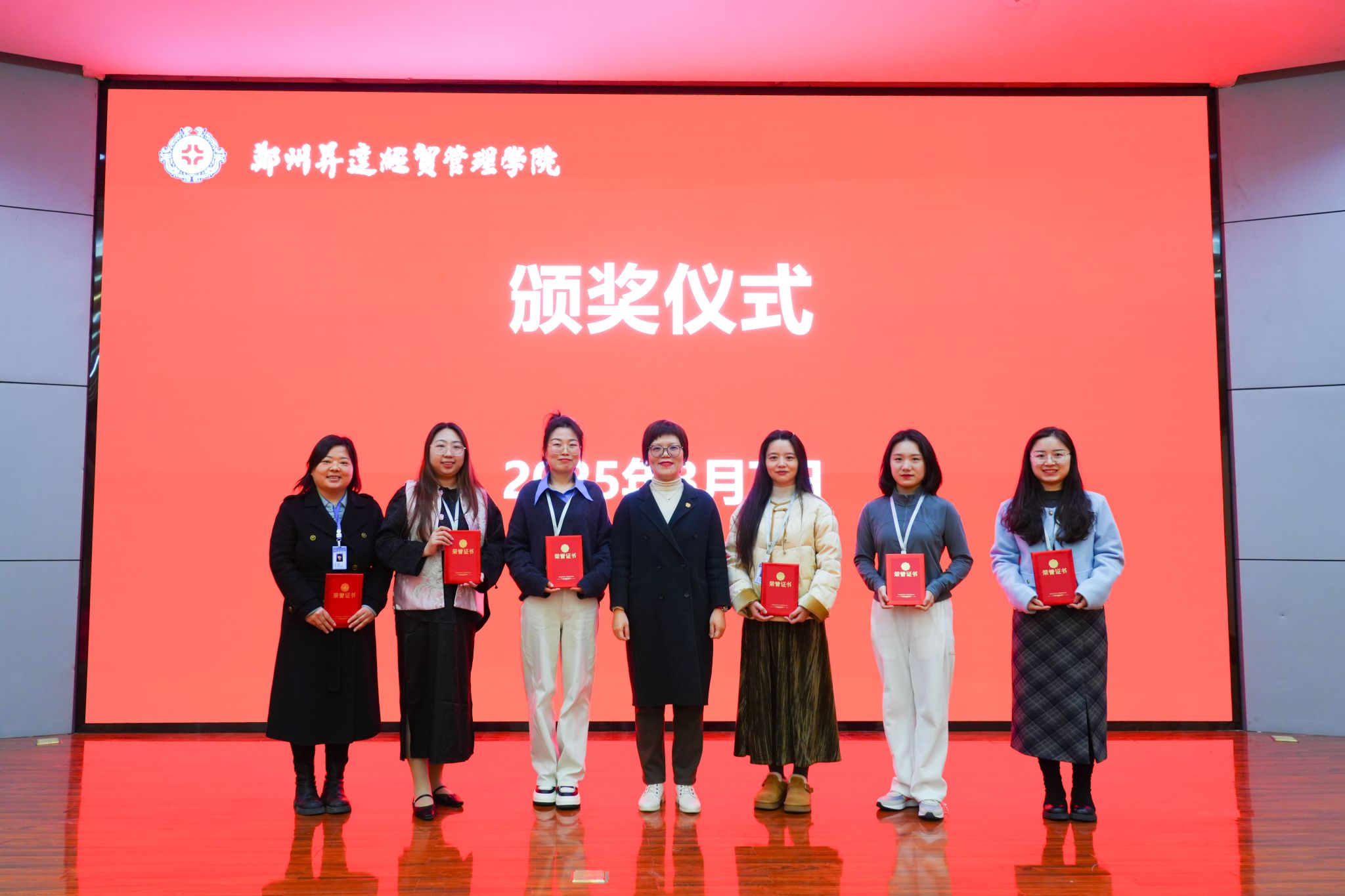表彰大会在国歌声中拉开序幕。张其武宣读了《郑州升达经贸管理学院工会委员会关于表彰“巾帼建功标兵”和“女职工先进集体”的决定》。