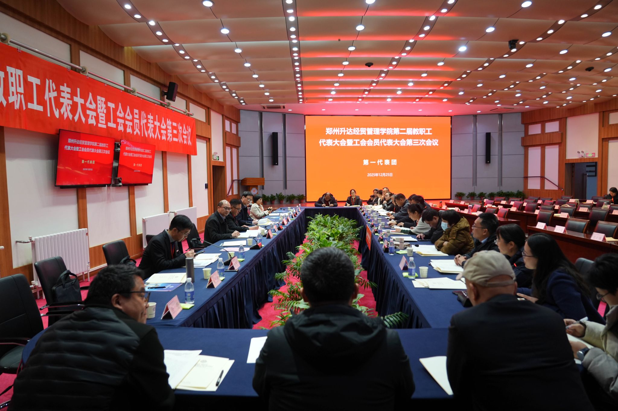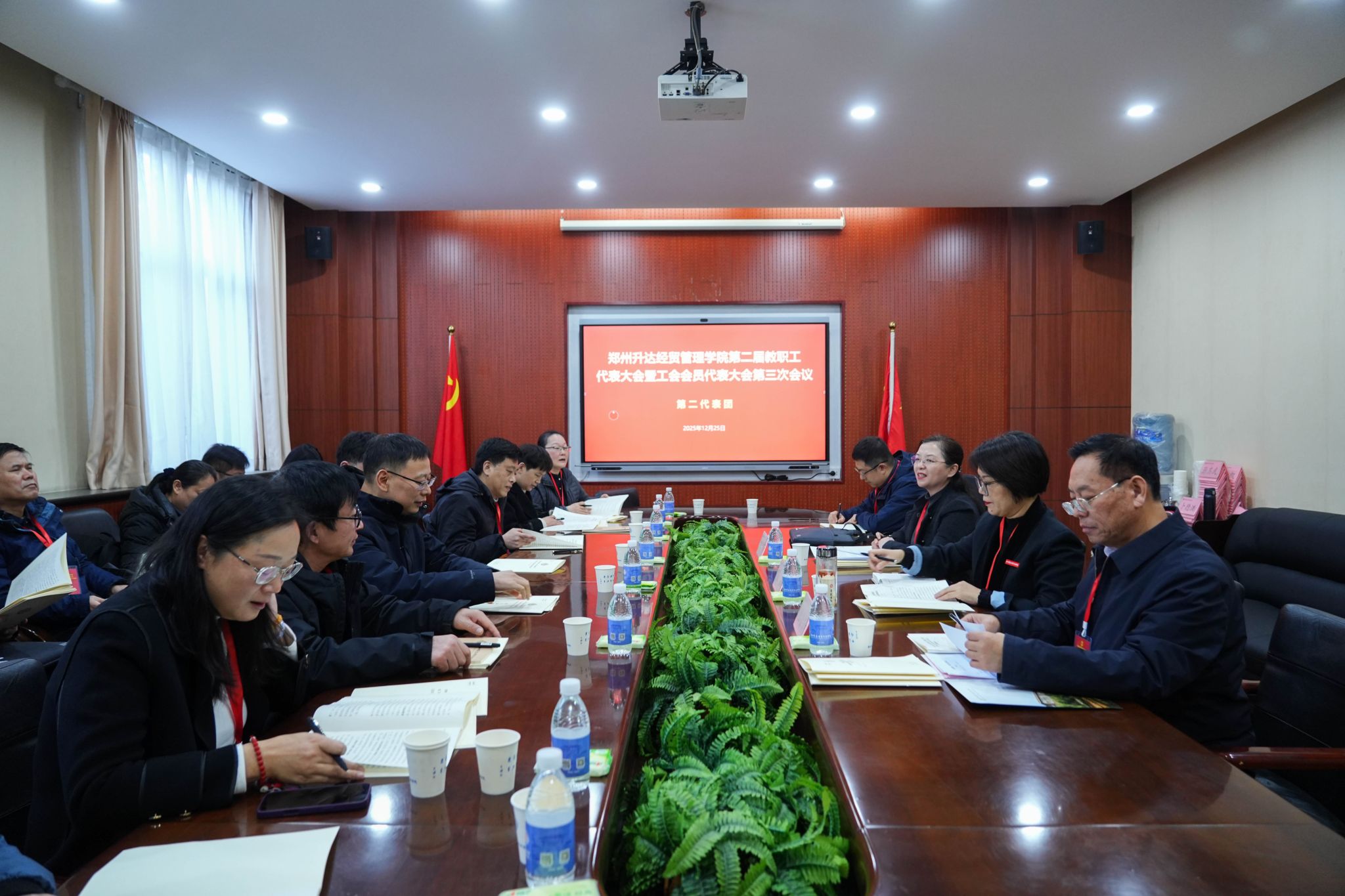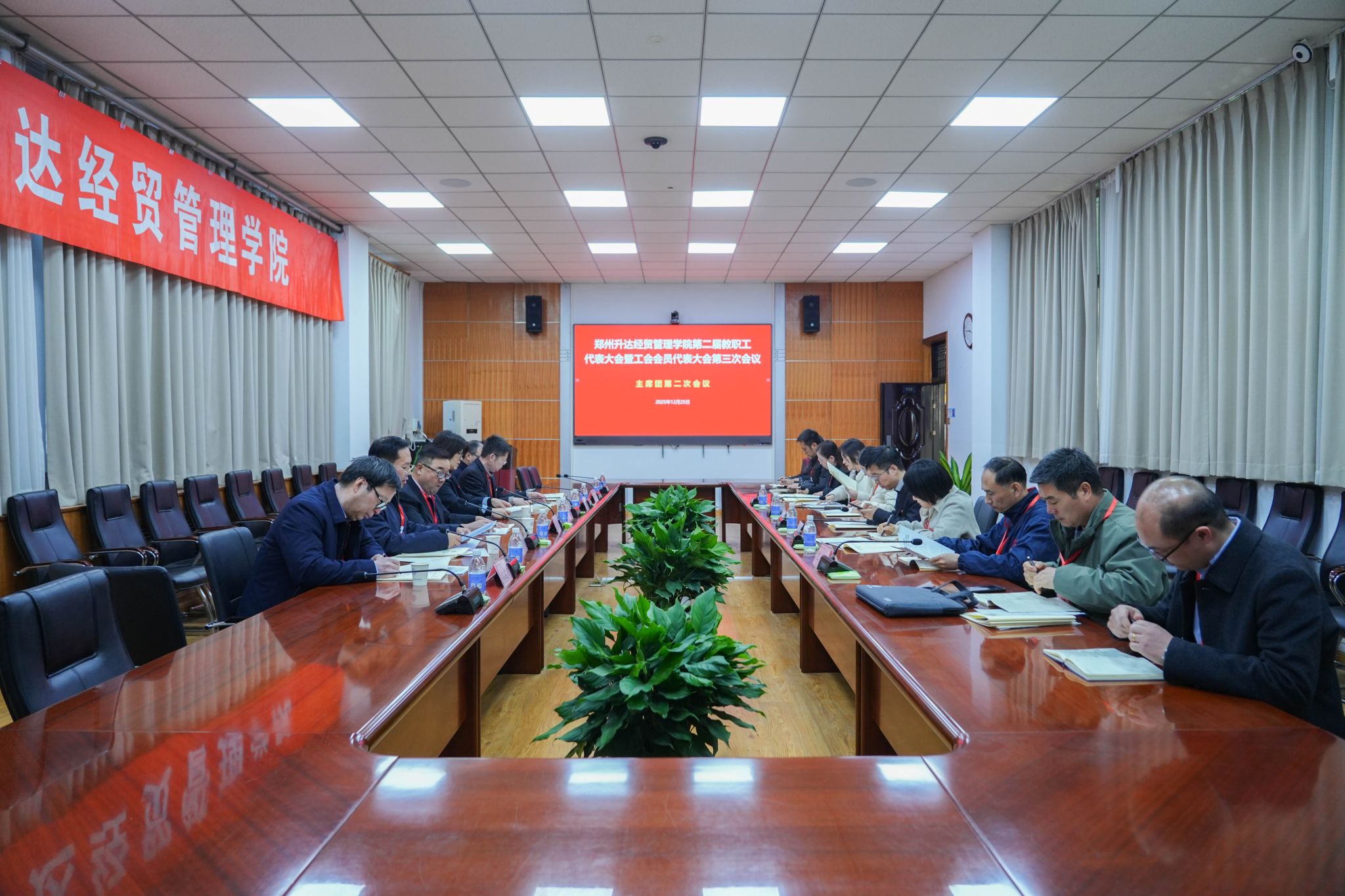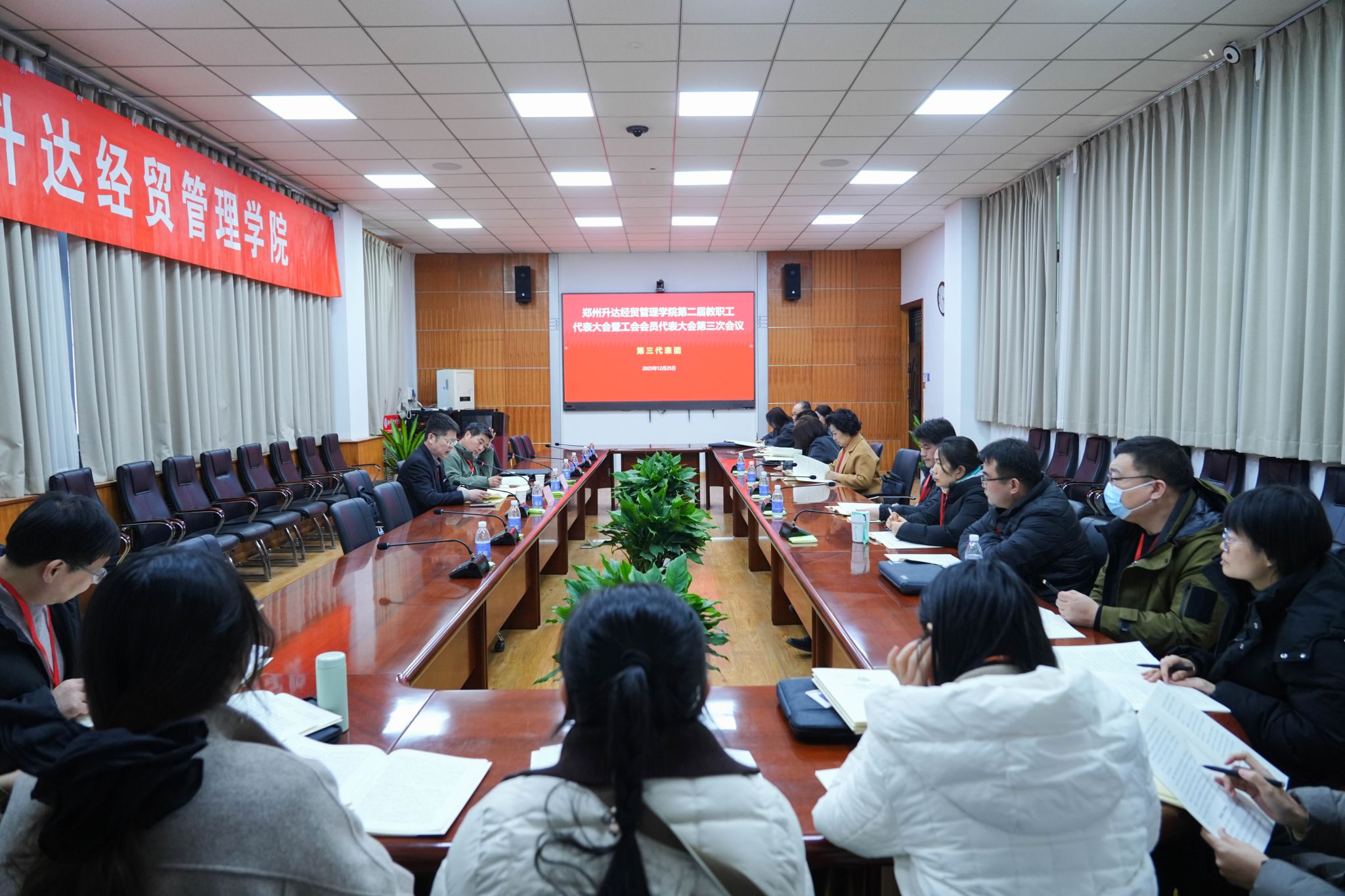 12月25日,为加强我校民主管理,充分发挥教职工行使民主权利、参政议政、民主管理的主人翁作用,我校第二届教职工代表大会暨工会会员代表大会第三次会议在国际会议厅召开。董事长王新奇,校长、党委副书记张欣,党委副书记、副校长、工会主席张金安,党委委员、副校长张其武,登封校区党工委书记沈定军等校领导出席会议。