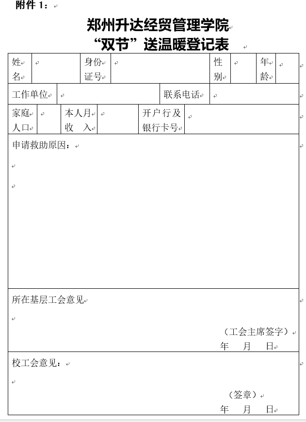 1.各分工会积极组织“双节”送温暖活动,按要求对照条件,由个人申报,填写郑州升达经贸管理学院“双节”送温暖登记表(附件1),各分工会主席审核汇总后报校工会。