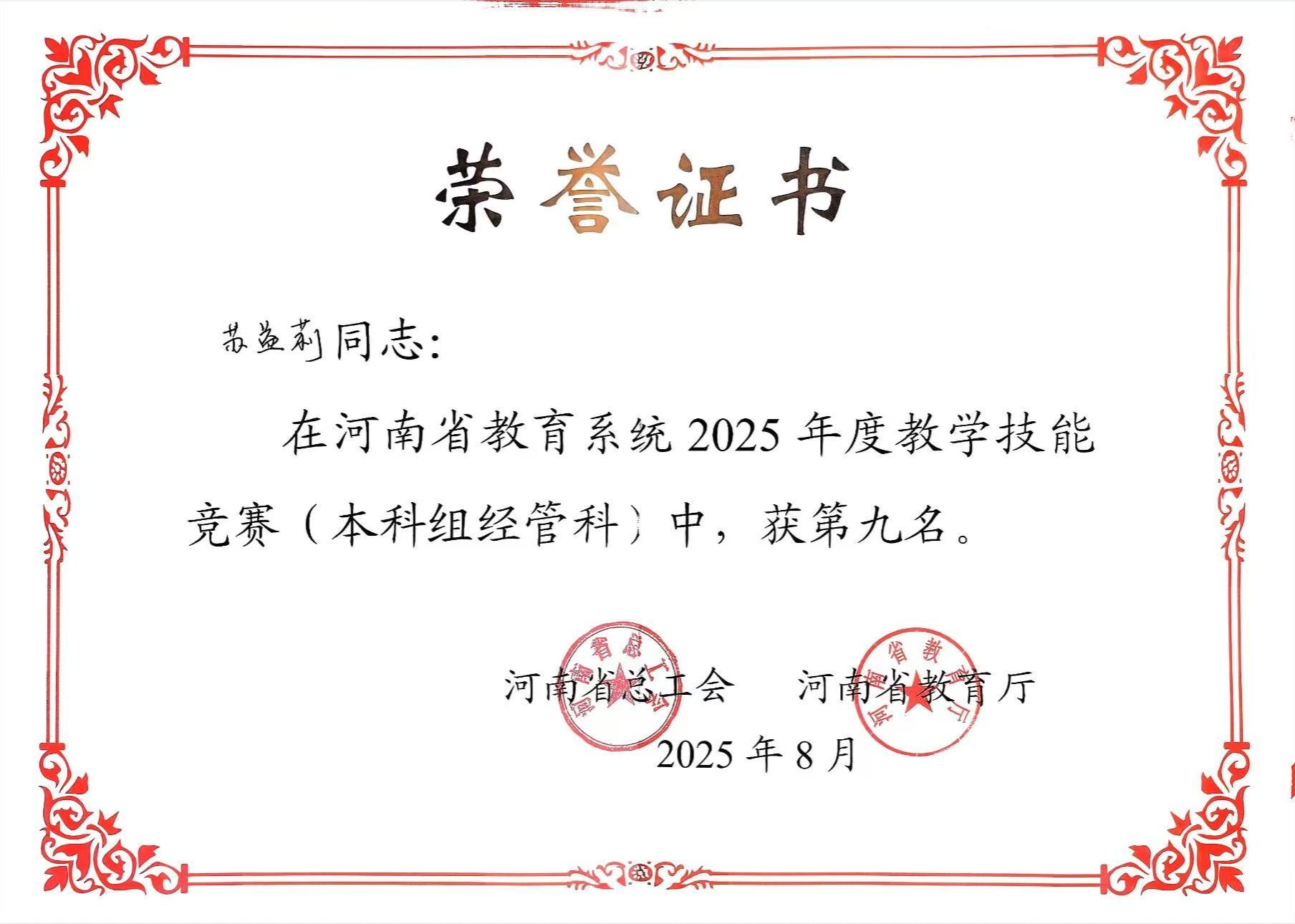 近日,河南省总工会、河南省教育厅联合印发《关于河南省教育系统2025年度教学技能竞赛获奖情况的通报》(豫工文﹝2025﹞73号)文件,我校选送的9位参赛教师分别在高校文科、高校经管科、高校理科、高校工科、高校思政科比赛中取得优异成绩,充分展现了我校教师扎实的教学功底与卓越的专业素养。