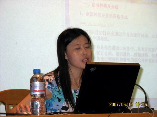 马教授介绍了八类国贸专业的实务证书: (1)全国外贸业务员资格考试 (2)全国国际商务单证员资格考试 (3)全国外贸跟单员资格考试 (4)全国国际商务英语等级考试(是外贸专业英语水平考试,不属于资格考试,与我们专业紧密相连,内容较四六级容易) (5)报关员考试 (6)报检员资格考试 (7)全国外销员和商务师考试 (8)全国国际货运代理从业人员资格。她指出,不必要盲目的去考所有的证书,要有选择性的去准备。对于物流专业的同学可以考“全国国际货运代理从业人员资格” 这一证书.。同时,在报告中马教授也提到了全国外贸资格考试的改革即:中国资格考试借鉴德国的”双元制”教育;中国的外贸形式发生了巨大变化;国家政策调整和企业观念的转变。