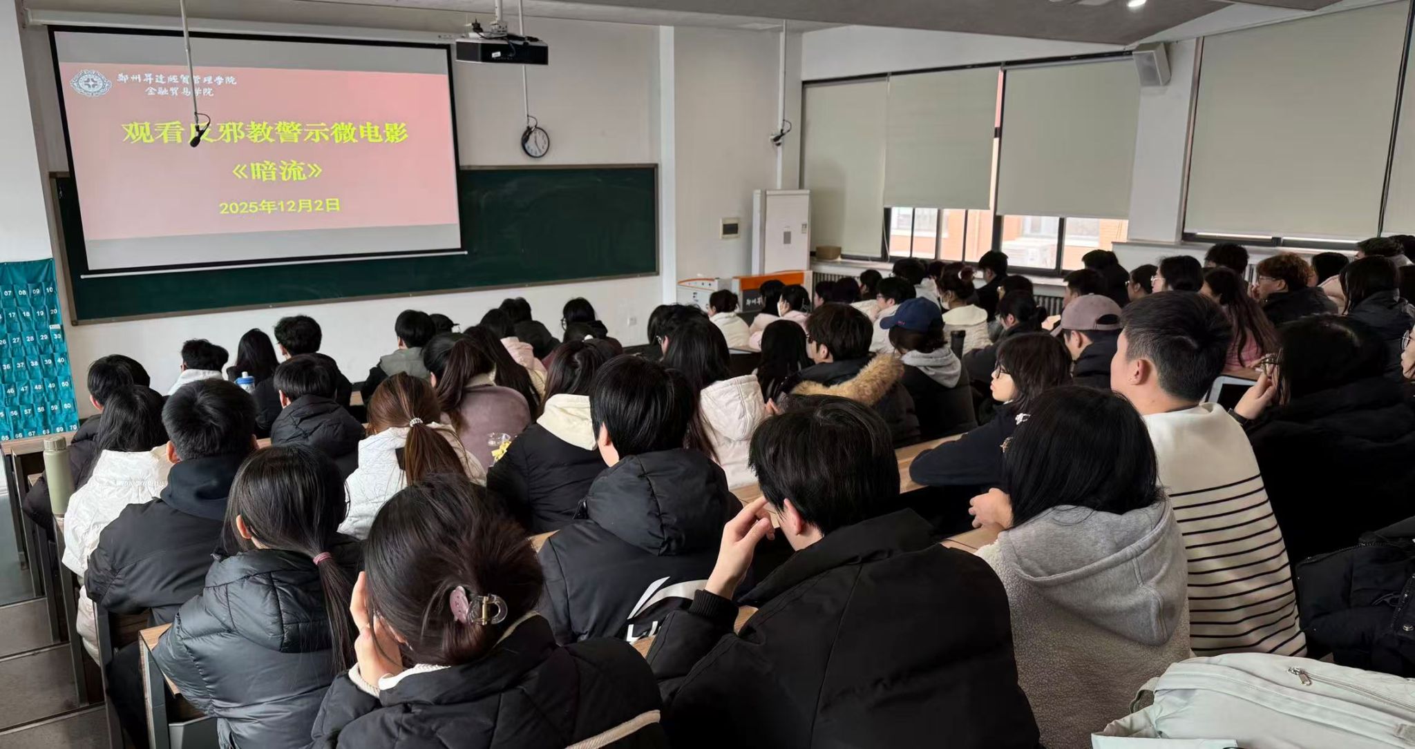为深入贯彻落实宪法宣传周工作要求,切实增强全院师生的法治意识和反邪教警惕性。12月2日,金融贸易学院反邪教协会在3号楼210教室组织学生集中观看反邪教警示微电影《暗流》,旨在通过影片案例增强学生的反邪防邪意识,筑牢思想防线。