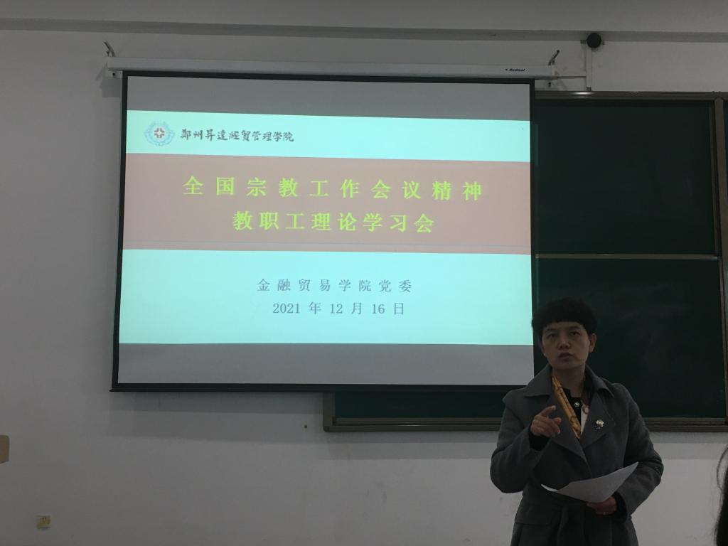 为深入贯彻落实习近平新时代中国特色社会主义思想和系列重要讲话精神,金融贸易学院党委组织“全国宗教工作会议精神”教职工理论学习会,根据学校2021年度教职工理论学习安排,金融贸易学院结合实际,12月16日下午,在教学3号楼107教室组织“全国宗教工作会议精神”教职工理论学习会。金贸学院党委书记钟江鸽、党委副书记、院长何伟、党委委员、副院长杨毅和学院全体教职工参加了本次理论学习。本次理论学习由金融贸易学院党委组织员李雷主持。