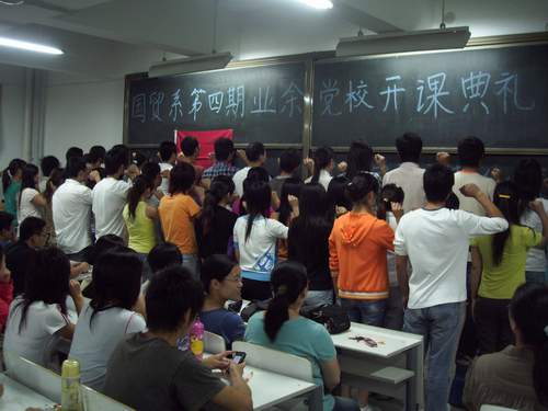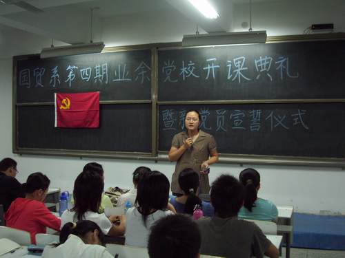 9月13日晚7:00,国际贸易系第四期业余党校开课典礼暨新党员宣誓大会于资讯楼213隆重举行。国贸系党总支副书记张小雁老师、04级党支部书记晋明明老师、05级党支部书记孙永杰老师、06级党支部书记闫帅老师、专升本党支部书记唐云老师以及国贸系全体辅导员出席了会议,会议由05级党支部书记孙永杰老师主持。
