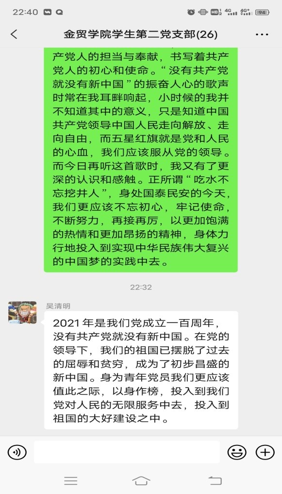 吴清明:2021年是我们党成立一百周年,没有共产党就没有新中国。在党的领导下,我们的祖国已摆脱了过去的屈辱和贫穷,成为了初步昌盛的新中国。身为青年党员我们更应该值此之际,以身作榜,投入到我们党对人民的无限服务中去,投入到祖国的大好建设之中。