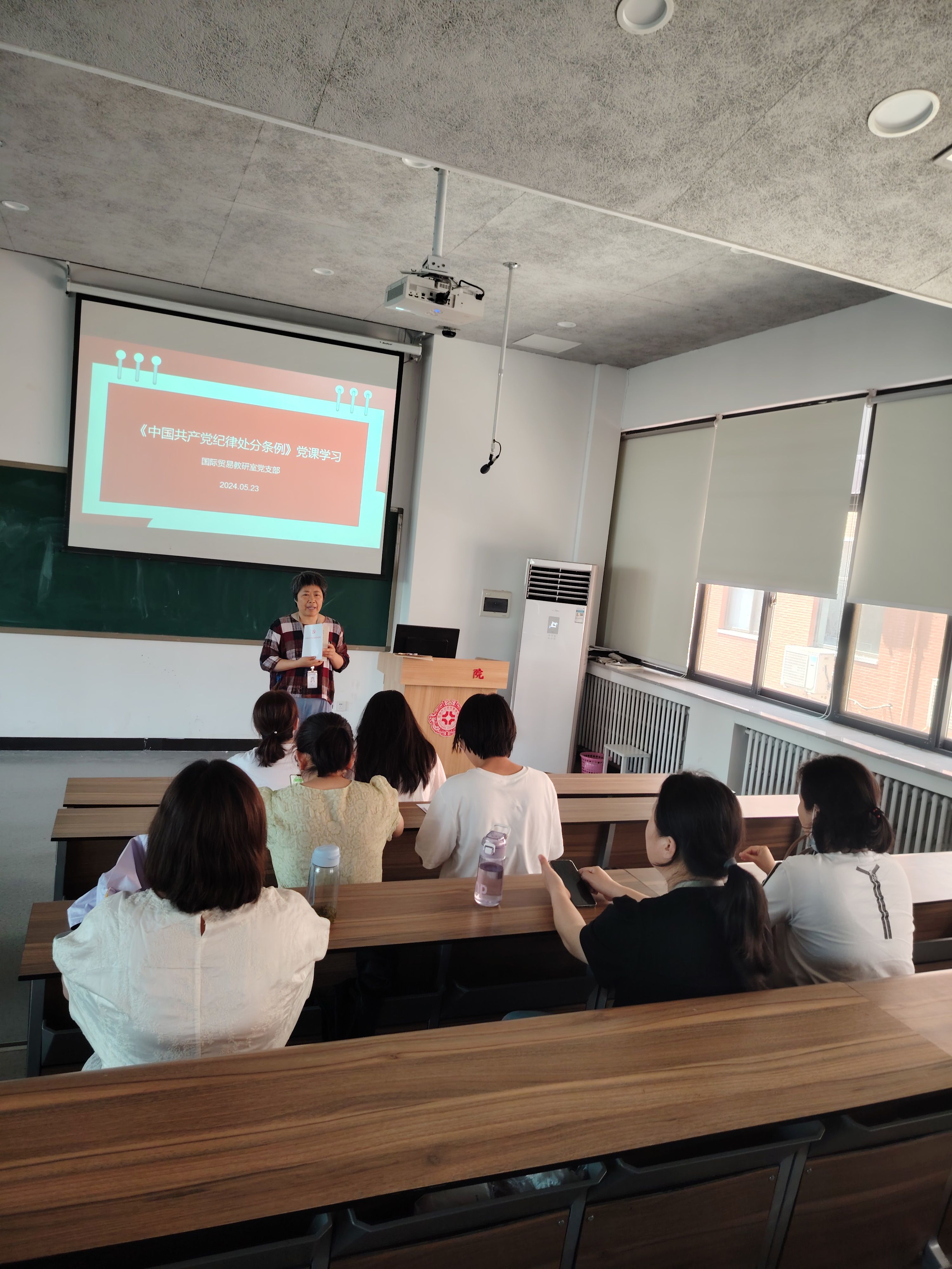 5月23日,国际贸易教研室党支部书记李秋娟为支部全体党员讲纪律党课。党课围绕《中国共产党纪律处分条例》中第六章对违反政治纪律行为的处分展开学习。