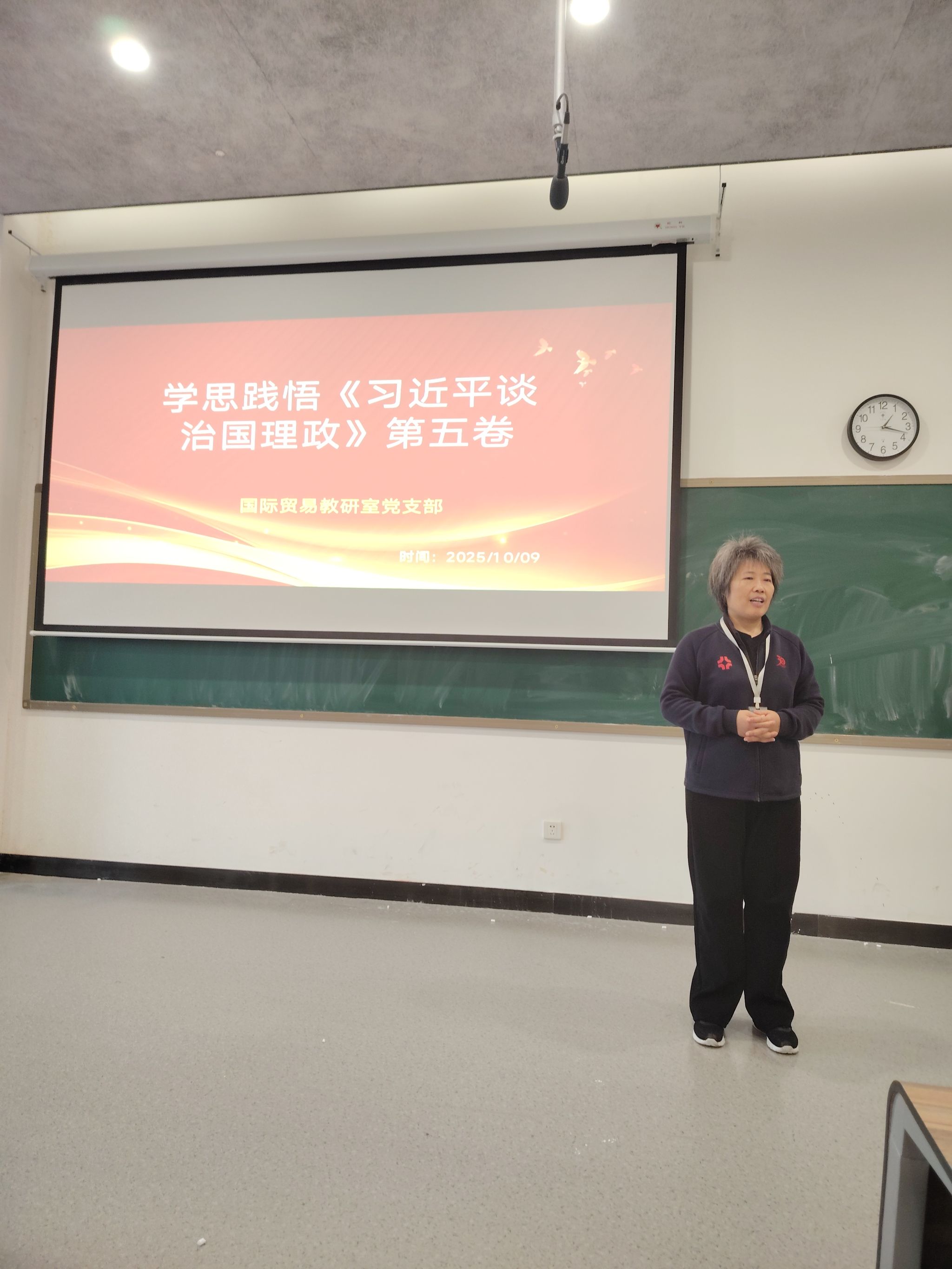 为深入学习贯彻习近平新时代中国特色社会主义思想,10月9日,国际贸易教研室党支部按照学院党委工作安排,组织全体党员教师开展《习近平谈治国理政》第五卷专题学习会,通过 “总览 + 精读” 的方式,推动理论学习走深走实、入脑入心。