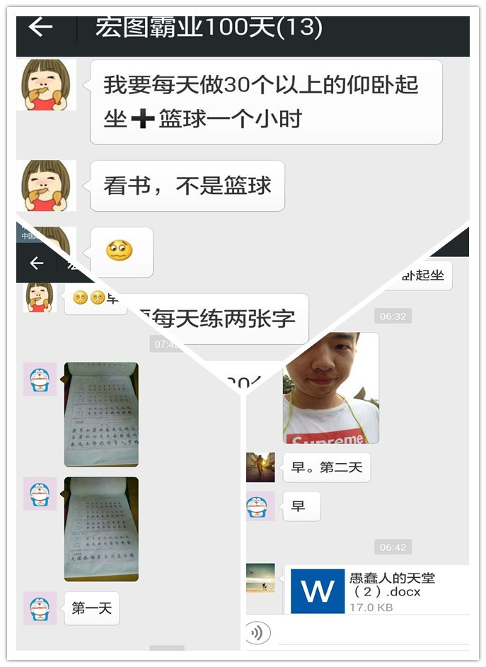 所有参与活动的成员组建了一个微信群,把自己想要养成的习惯在群内说明,并在备注中表明,让群内的每一个人知道你想要养养成的习惯。每天在完成之后在群内用照片签到,让身边的每一个人督促你完成,如果没有完成也设置了相应的惩罚。所有的活动设置都是为了能够把想要改变自己的人,想要成长的人组织在一起,相互之间成为前行的同伴,互相督促,互相进步,一起成长!