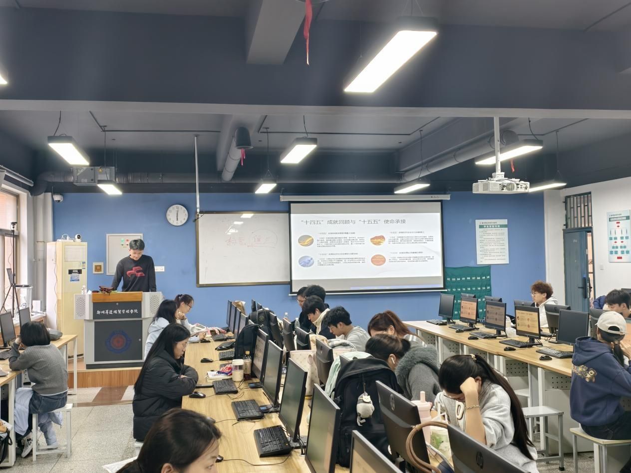 宣讲会上,团支部书记陈鎏喆同学首先就“十五五”规划的制定背景、核心目标及战略重点进行了系统解读。陈鎏喆表示,“十五五”时期是国家发展的关键阶段,作为共青团员,应主动关注国家发展大势,将专业学习与未来规划相结合,为实现宏伟蓝图贡献青春智慧。学生代表吴育播发言认为,本次宣讲将有助于更清晰地理解国家战略,激发了将个人成长融入国家发展的内在动力。