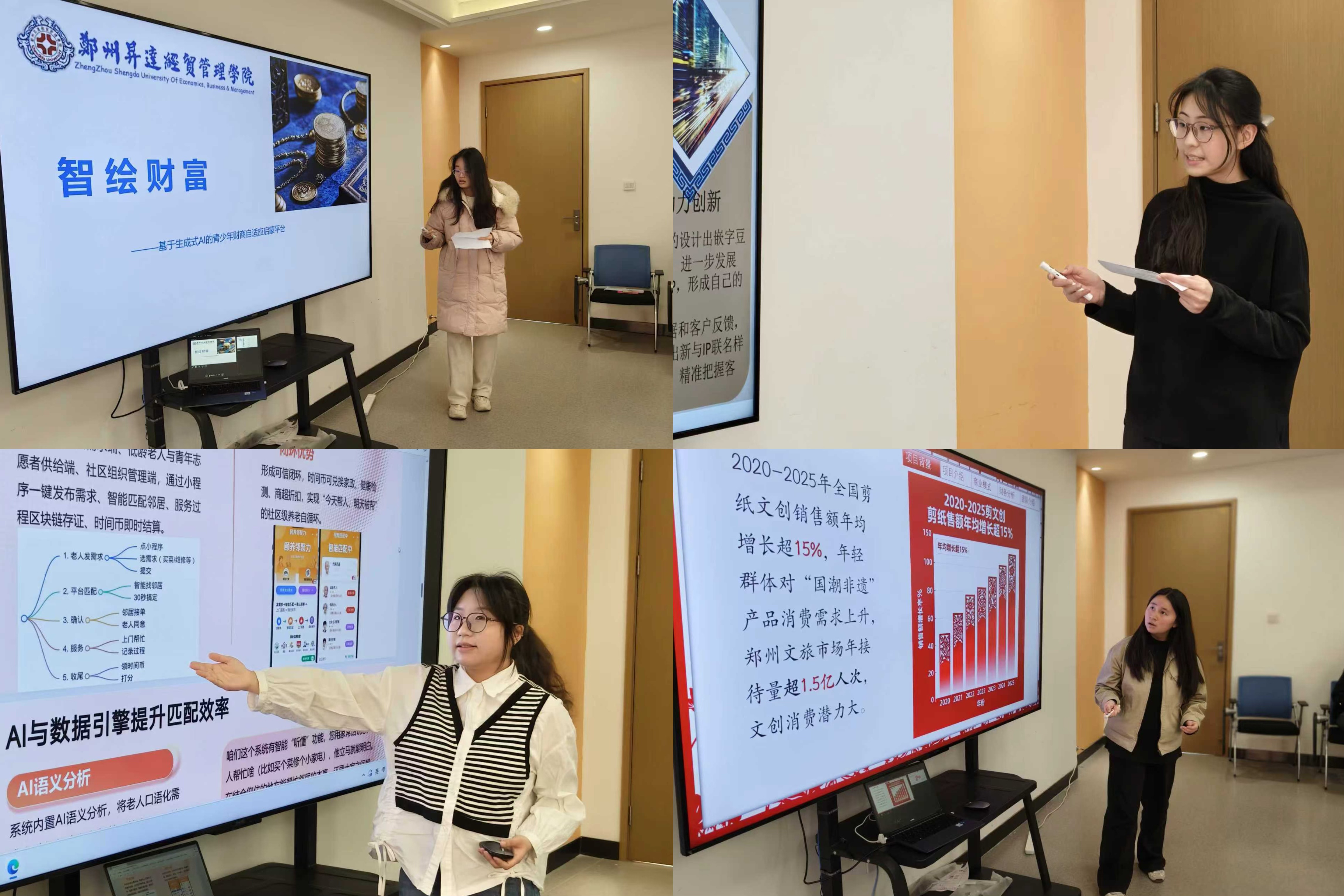 本次赛事汇聚学院优秀参赛团队同台竞技,展现了金贸学子深耕专业、赋能实践的创新创业活力。比赛现场,各参赛团队紧扣科技创新和未来产业、乡村振兴、社会治理、绿色低碳、文化创意五大核心赛道,深度结合金融贸易专业特色,带来了一批兼具创意性与实用性的优质项目。