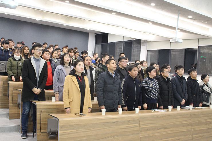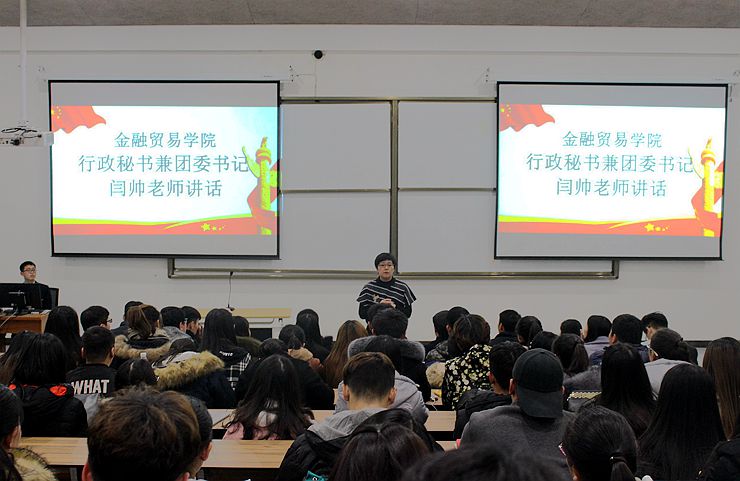 2017年12月20日晚,由金融贸易学院团委主办、组织部承办的第三期团校金贸学院班结业典礼在三号楼举行。出席本次典礼的嘉宾有:金贸学院行政秘书兼团委书记闫帅老师、17级新生辅导员常单单老师、苏浩老师、徐依凡老师、朱风顺老师,校团委组织部副部长王睿琪,组织部部长助理马玉龙、金贸学院团委副书记李征宇、学生会主席李浩天,副主席李宏润、郭晓阳,社团联合会理事长白嘉伟及各部门部长。主持人为闫鑫。
