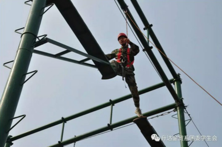 第三项任务为高空断桥,参加的人员在本队队长和政委的帮助下穿戴安全装备,爬上十米高台,跳过距离为一米的断桥,从断桥上落下。队员们都敢为人人先,对于十米高台虽内心有所恐惧,但是都能够战胜自己,他们的勇气和决心获得了教官的一致好评,展示我系同学们的良好精神风貌。