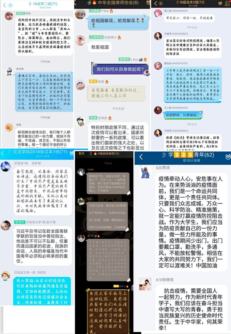 马克思主义学院翟效颜老师说,面对疫情,我们每个人都深切感受到了家国情怀和社会主义大家庭的温暖。大学生是实现中华民族伟大复兴的后备力量,是影响社会主义现代化建设进程的重要力量。作为思政课教师教师要积极引导学生树立崇高的理想信念,培养他们的责任担当和纪律意识,让他们时刻把个人前途命运与国家、民族的前途命运紧密联系在一起,尽心尽力、实干进取,在社会主义现代化建设的伟大实践中建功立业、书写人生辉煌。