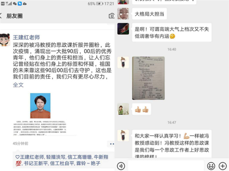 马克思主义学院陈芳老师谈到,作为思政课教师,我们要把疫情防控的这些生动事例融入到思政课教学中,以疫情为契机,引导大学生,以积极的、正常的状态去面对当前的社会环境,进一步培养学生的爱国情怀和社会责任感,深入推进立德树人。同时,中国奇迹、中国力量、中国速度再一次让世界瞩目,充分体现了中国特色社会主义制度的巨大优势,通过这些让每一位青年学生更加坚信社会主义制度,进一步激发学生的爱国热情。