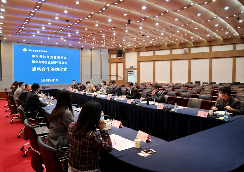 微风和煦,阳光明媚。4月17日上午,我校与河南杨金高科技创业园区发展有限公司战略合作签约仪式在国际会议厅隆重举行。河南杨金高科技创业园区有限公司总经理张保柱先生、副总经理李鹏强先生、信息技术部部长荆艳玲女士、综合管理部部长文静女士、孵化器部长毋潇女士、电商部负责人袁明娅女士、跨境电商部负责人郭小青女士,我校执行董事王新奇、校长郭爱先、副校长张金安、副校长吴益民出席了签约仪式。发展规划处兼校地合作处处长沈定军、科研处处长杨存博、双创学院院长王铮、商学院代院长白鹏飞、信工学院代院长白鑫、基础部主任王莉莉及部分同仁参加了签约仪式。签约仪式由副校长吴益民主持。