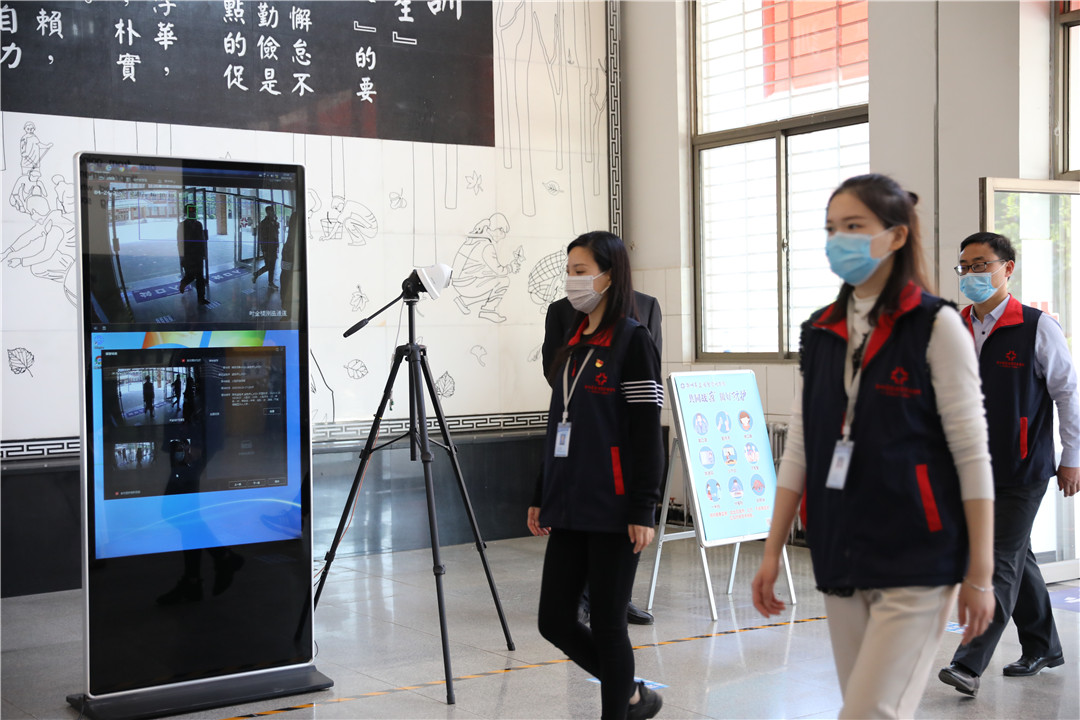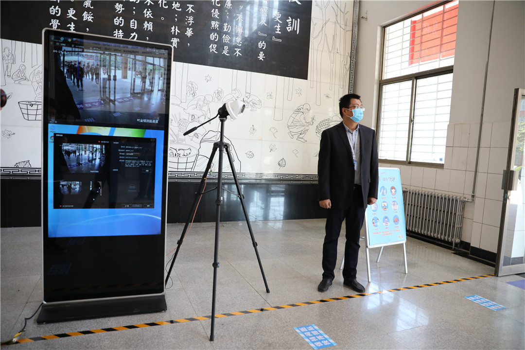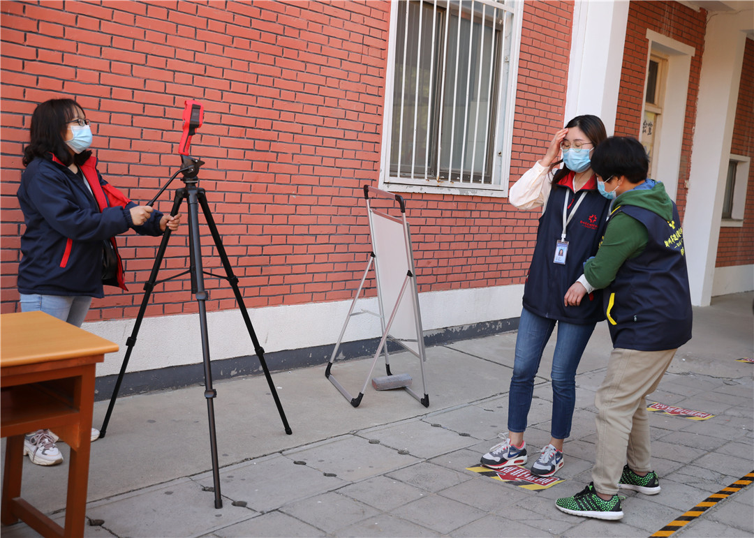 “学生”依次通过教学楼门口的红外测温仪检测体温