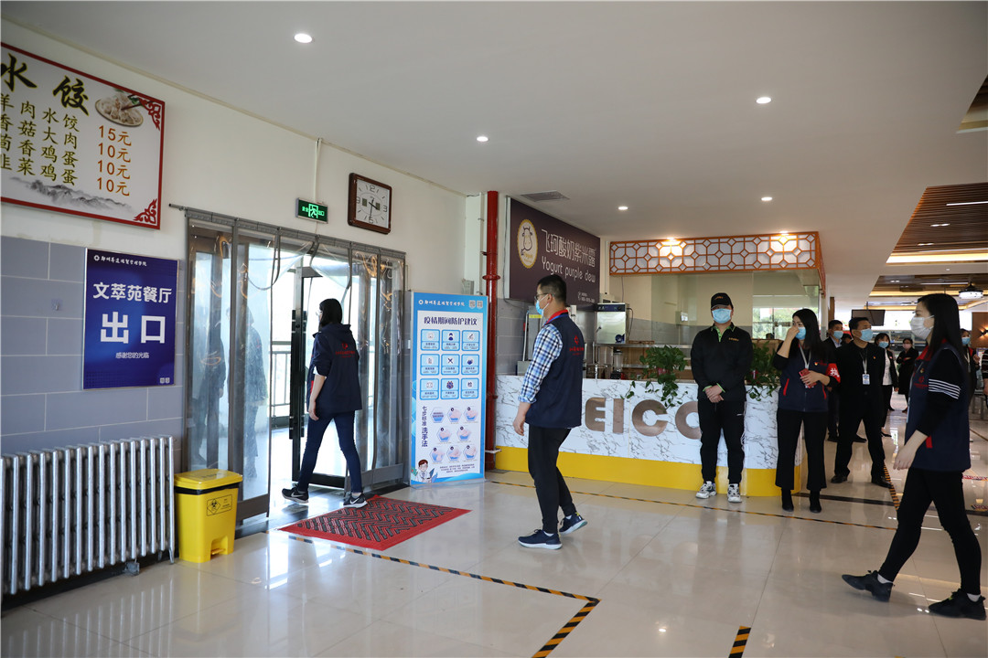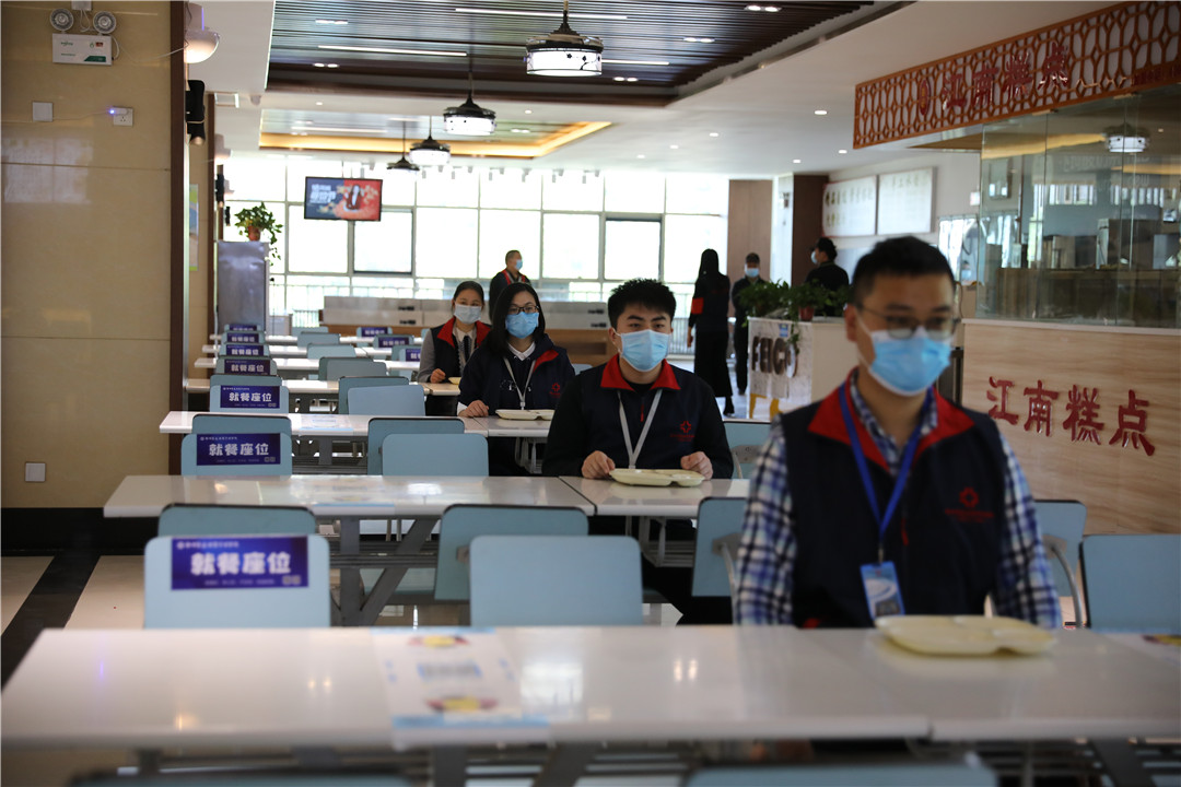购餐时,“学生”按照标线标识间隔1.5米,有序排队购餐。购餐后,“学生”无接触刷卡付款,可打包在宿舍就餐,也可选择在餐厅指定区域就餐。