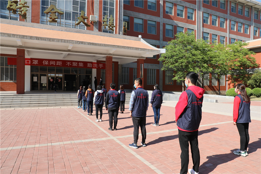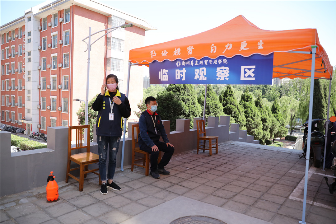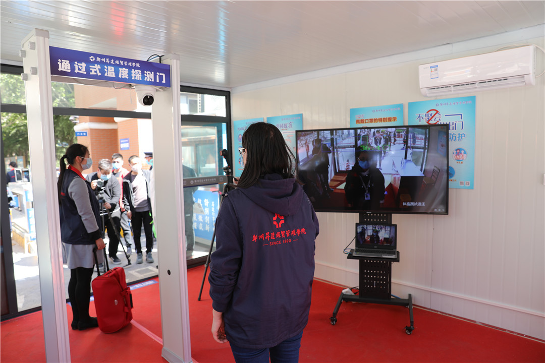 我校在西大门外南侧设置了进校等候区,工作人员负责引导“学生”到等候区,指导学生提前准备健康扫码信息,保卫人员负责交通疏导。“学生”在等候区有序排队,间隔1.5米。“学生”扫描二维码,扫码结果为绿码者,依次在通过式温度探测门迅速测量体温,体温正常者在指定入口刷脸验证身份信息,确保是本校学生后,允许进入校园。发现体温异常的“学生”,立即启动应急处置程序,迅速带至校门外临时观察区,并及时对测温现场进行消杀处理。临时观察区医护人员给“学生”发放一次性医用外科口罩,指导其正确佩戴;同时进行旅居、接触史等流行病学调查、信息登记和体温复检。复查体温正常者,进入身份信息核验阶段,验证通过后进入校园。如果体温复检仍异常者,或具有流行病学特征和症状表现,第一时间上报学校疫情防控指挥部,用疫情防控专用转运车辆转送至河南省第二人民医院发热门诊进一步检查、排查。