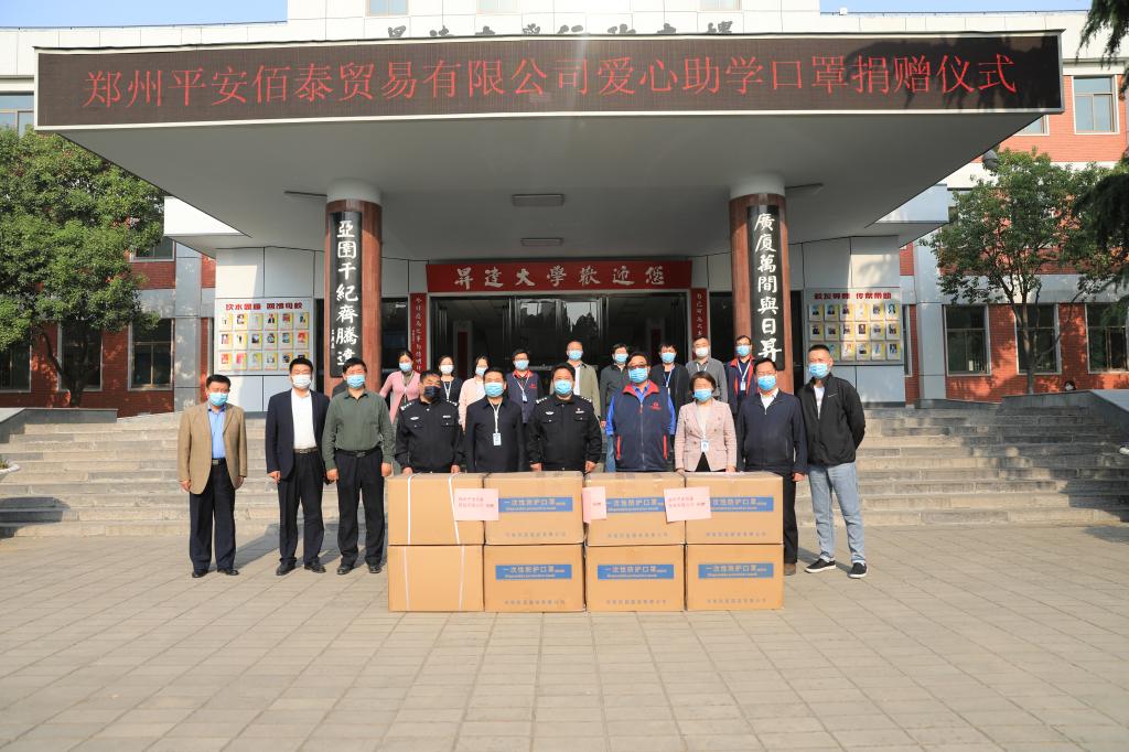 4月26日下午,郑州平安佰泰贸易有限公司领导一行莅临我校,向我校无偿捐赠30000只口罩和100件防护服。校领导执行董事王新奇、校长郭爱先、党委书记张德伟、党委副书记兼纪委书记戎庭银,副校长兼工会主席张金安、副校长兼教务长吴益民以及各部门主管参加了捐赠仪式。