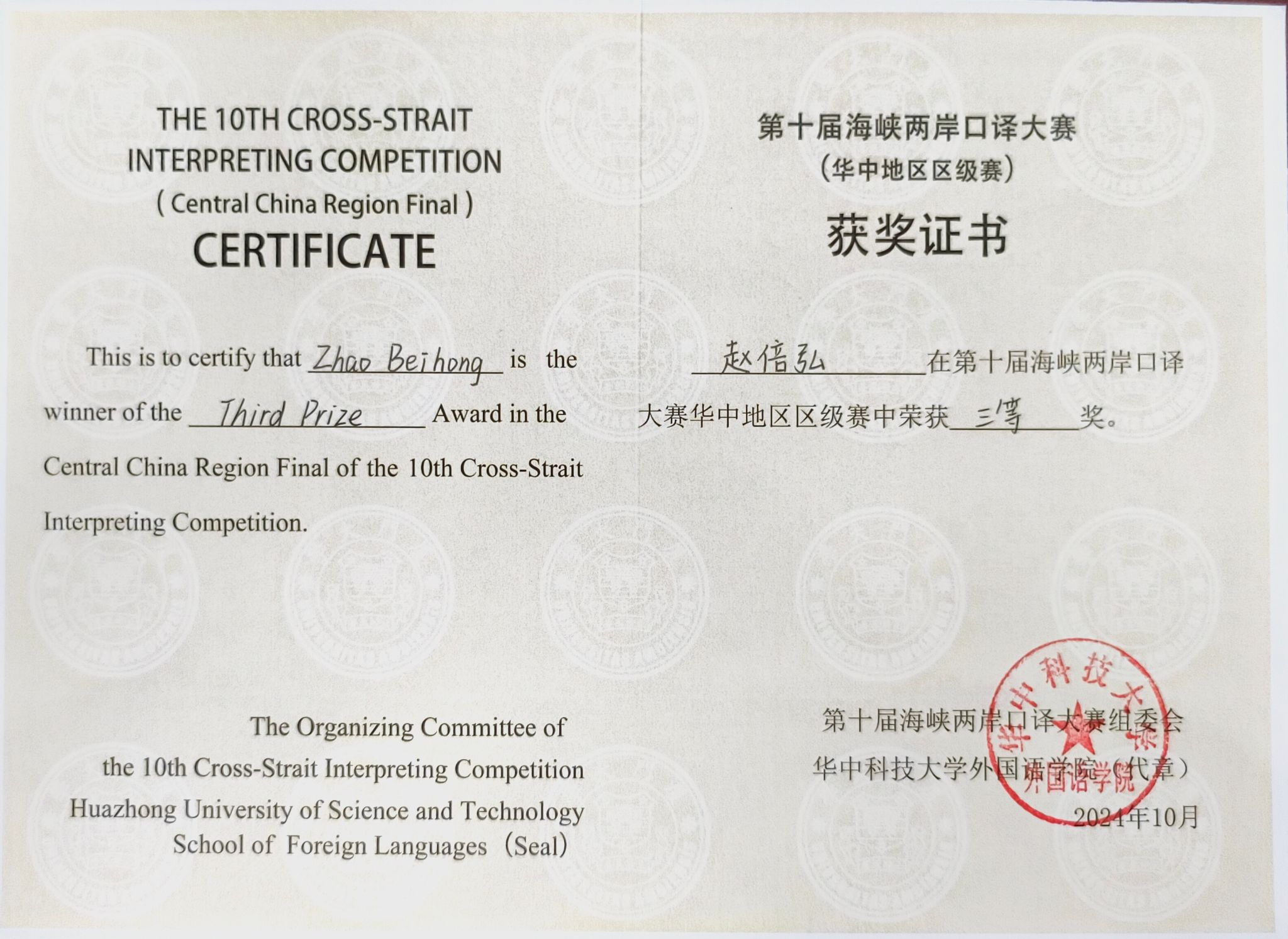 10月20日,第十届海峡两岸口译大赛华中区赛顺利落幕。第十届海峡两岸口译大赛华中区赛由厦门大学主办,华中科技大学承办,湖南、湖北、安徽、河南四省近30所高校的本科生及研究生入围本场比赛,同台竞技。经过激烈的角逐,我校外国语学院2021级翻译专业赵倍弘同学荣获华中赛区三等奖。