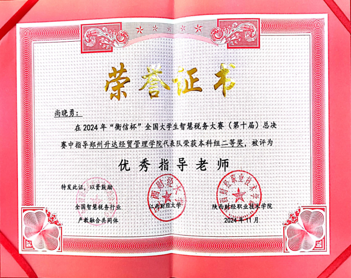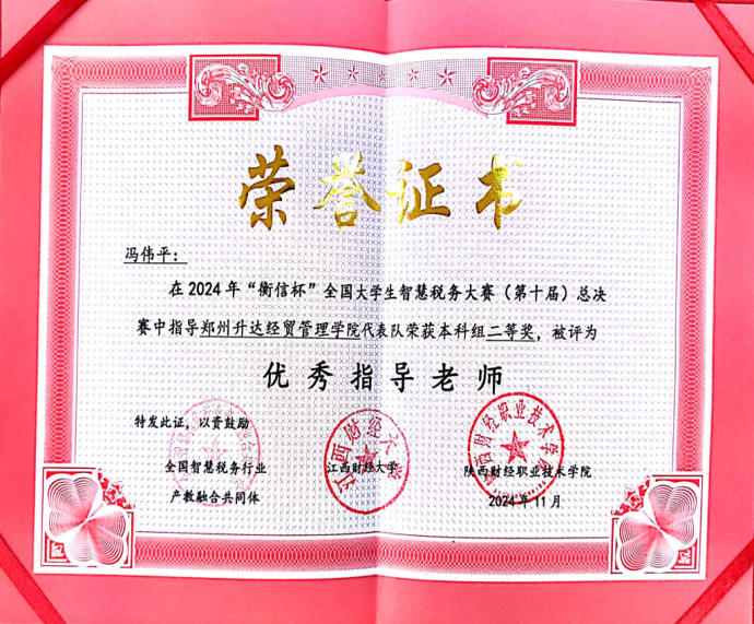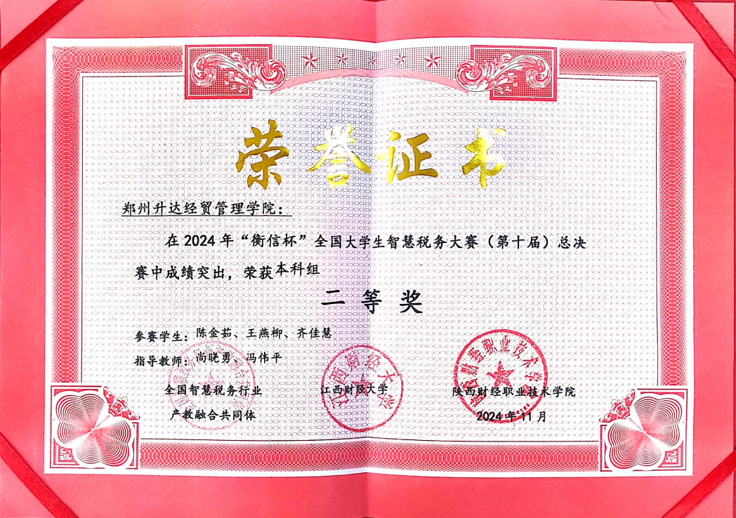第十届“衡信杯”智慧税务大赛由全国智慧税务行业产教融合共同体,江西财经大学所主办,其中不乏西南财经大学、中南财经大学、江西财经大学等诸多名校财经类强队参与竞赛,我校会计学院的学子们不畏强手,冷静答题,最终能够脱颖而出,是学院长期以来注重教学质量、强化实践教学、鼓励学生积极参加大赛的结果,学院将以此为契机,持续深化教学改革,加强学科建设,培养更多高素质税收专业人才,为推动智慧税务事业发展做出了积极贡献!