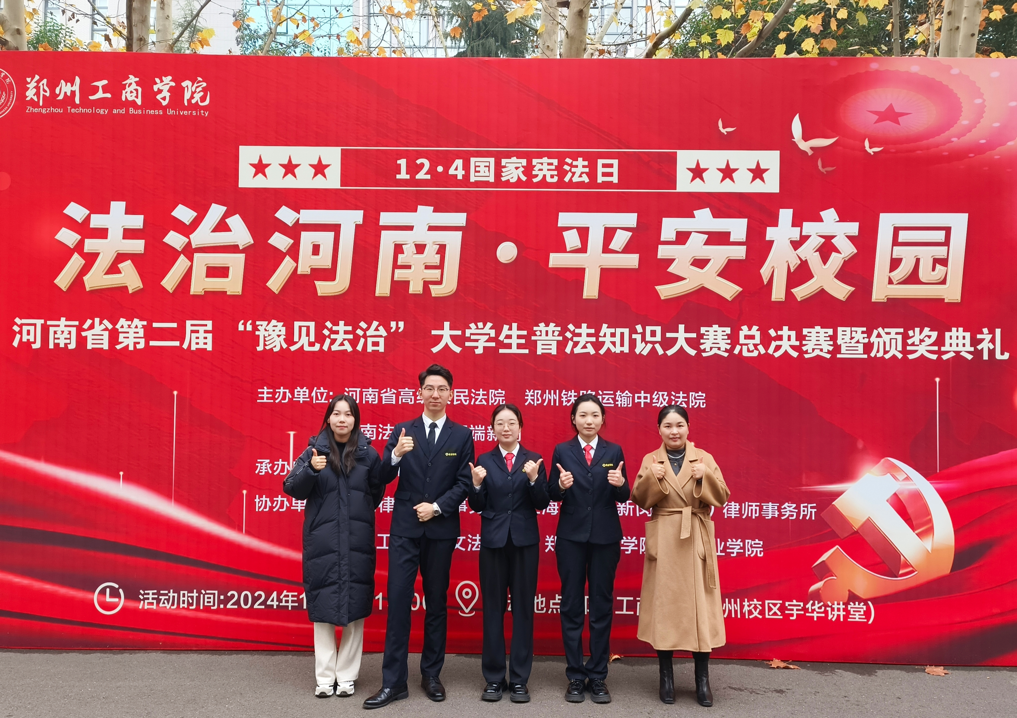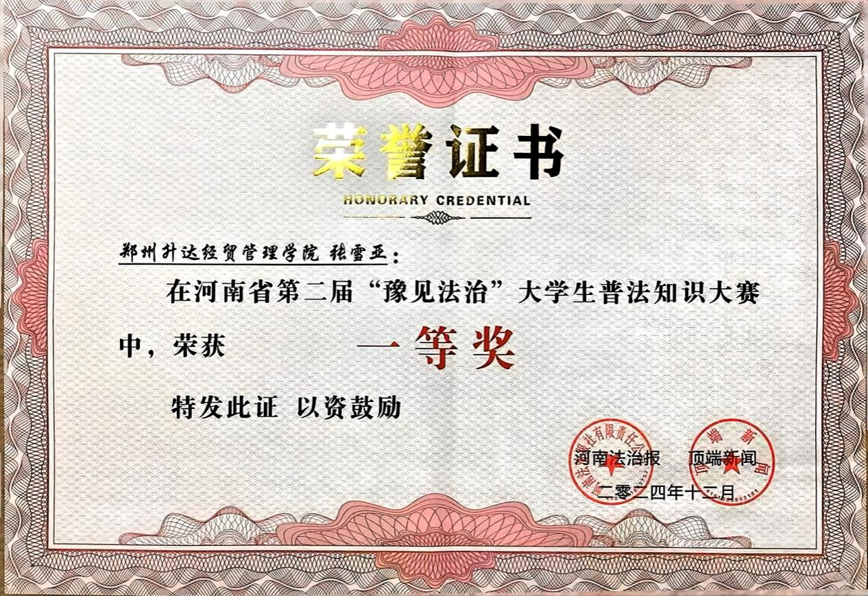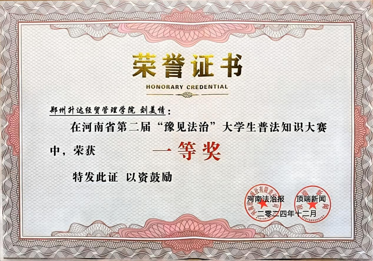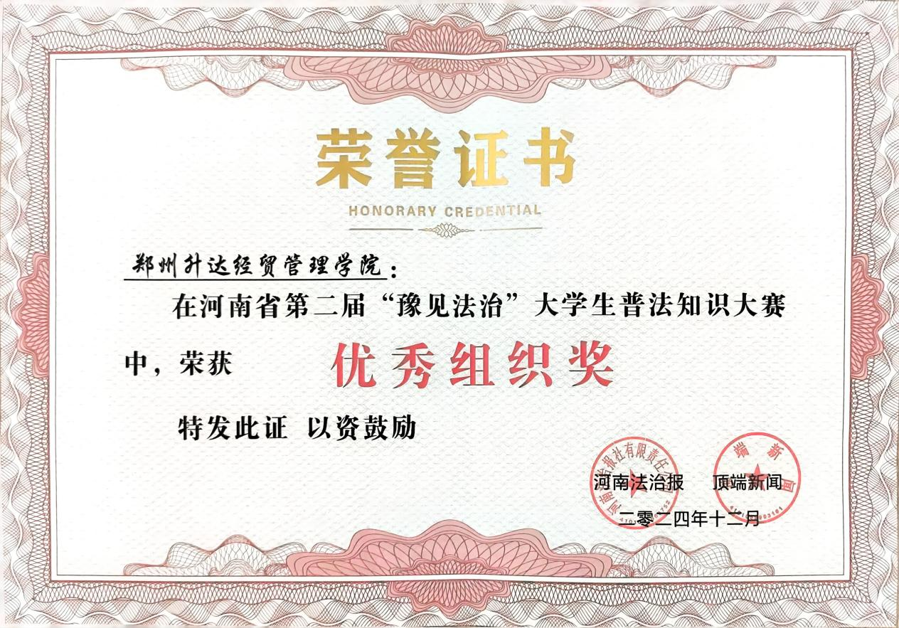为深入学习贯彻习近平法治思想,大力弘扬宪法精神,促进平安校园建设,增强大学生环保法治意识,12月4日,由河南省高级人民法院、郑州铁路运输中级人民法院、河南法治报、顶端新闻主办的河南省第二届“豫见法治”大学生普法知识大赛总决赛暨颁奖典礼在郑州正式举行。由我校文法学院院长、法制办主任段丰乐指导,侯培娟、刘瑞老师带队的刘美情、张雪亚、史加兴参赛团队代表我校参赛。参赛团队经过“初露锋芒”“抢先出击”“终极较量”三轮环节的激烈角逐,最终不负众望荣获一等奖,侯培娟、刘瑞老师荣获优秀指导老师称号,我校荣获优秀组织奖。