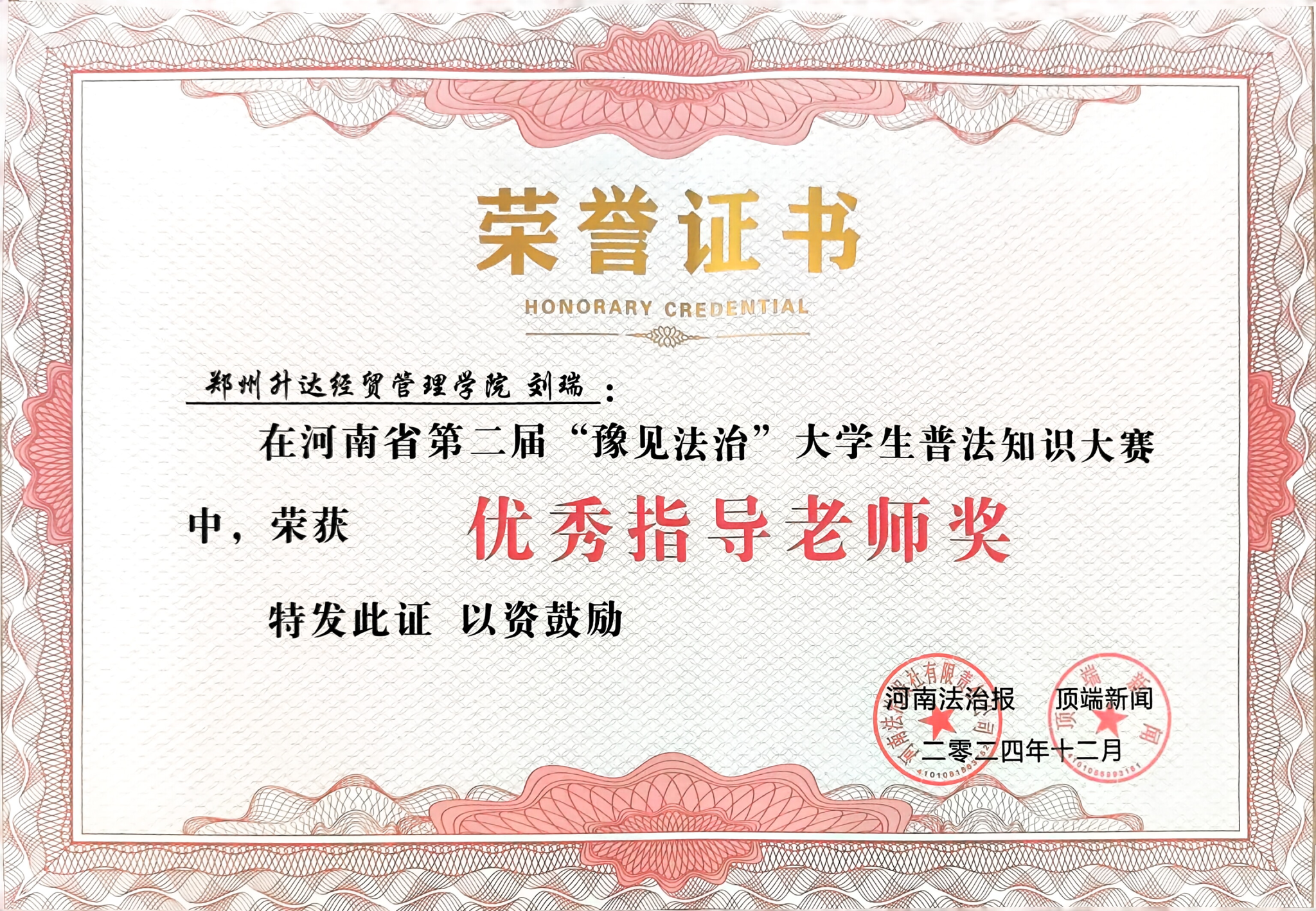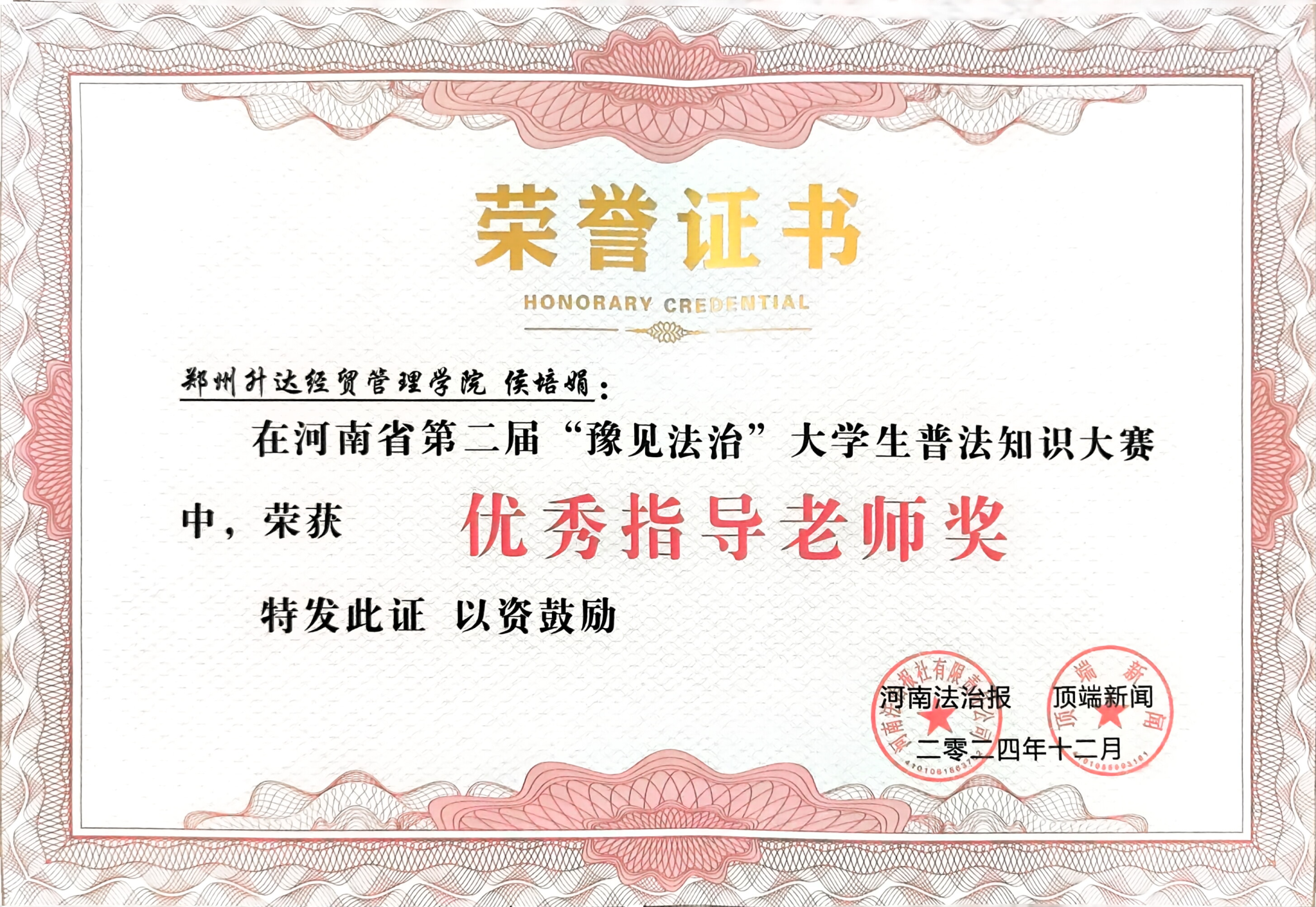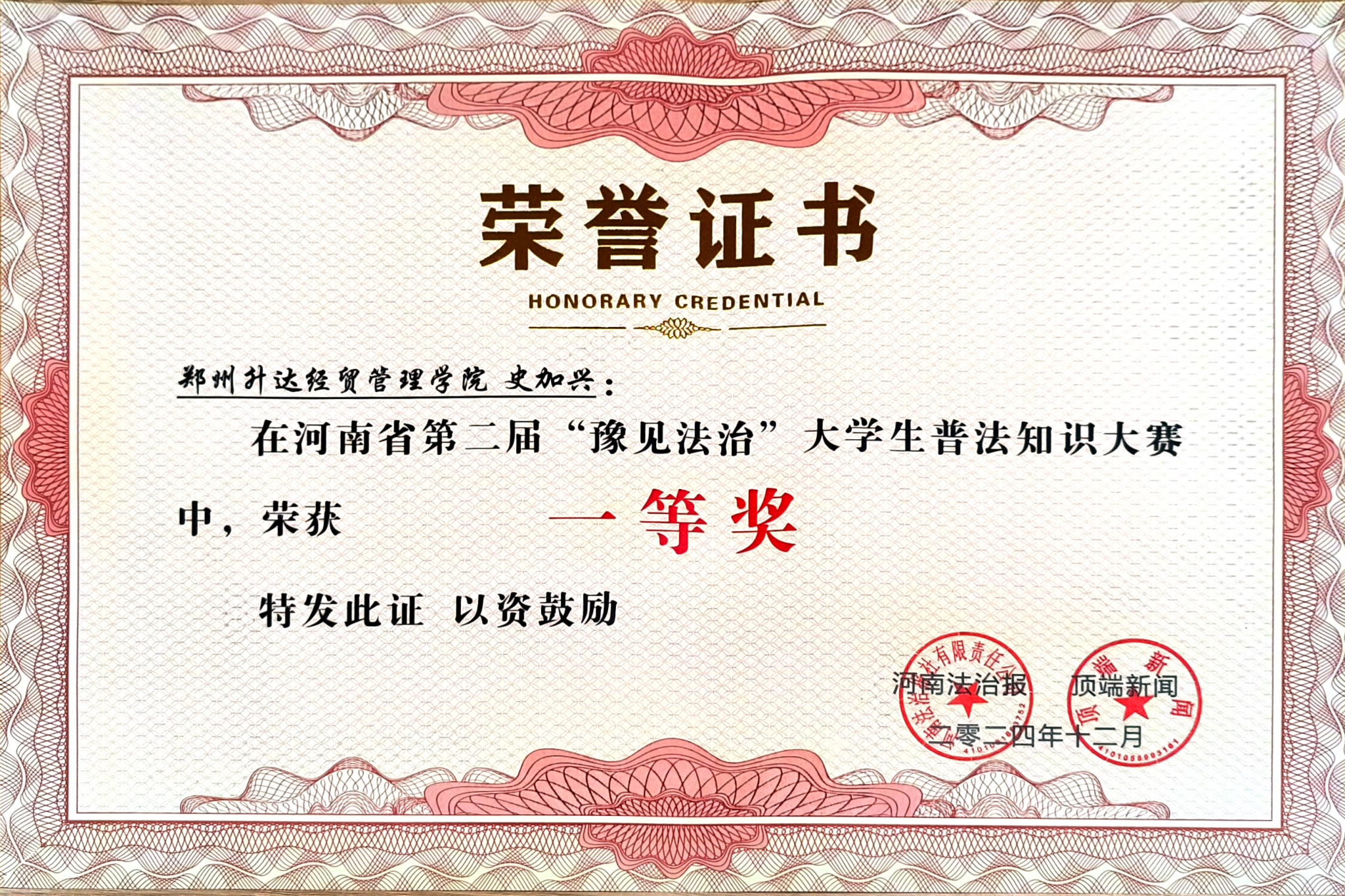 为深入学习贯彻习近平法治思想,大力弘扬宪法精神,促进平安校园建设,增强大学生环保法治意识,12月4日,由河南省高级人民法院、郑州铁路运输中级人民法院、河南法治报、顶端新闻主办的河南省第二届“豫见法治”大学生普法知识大赛总决赛暨颁奖典礼在郑州正式举行。由我校文法学院院长、法制办主任段丰乐指导,侯培娟、刘瑞老师带队的刘美情、张雪亚、史加兴参赛团队代表我校参赛。参赛团队经过“初露锋芒”“抢先出击”“终极较量”三轮环节的激烈角逐,最终不负众望荣获一等奖,侯培娟、刘瑞老师荣获优秀指导老师称号,我校荣获优秀组织奖。