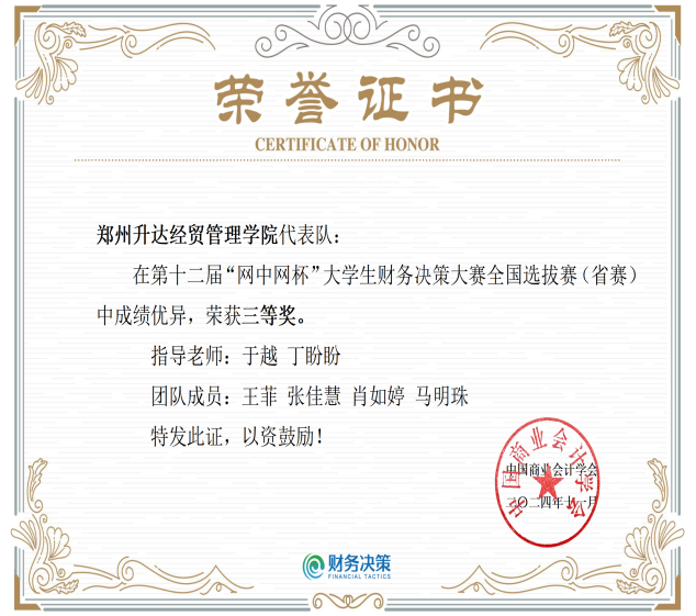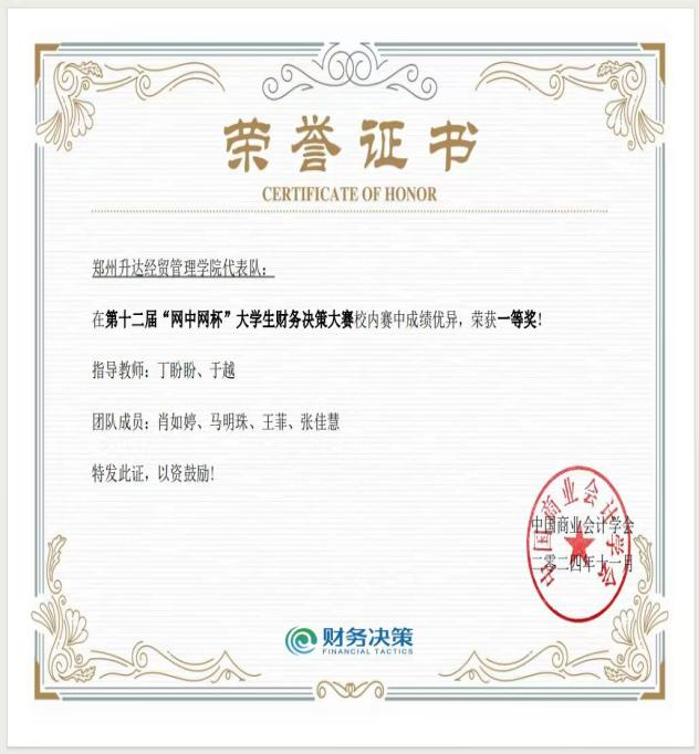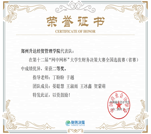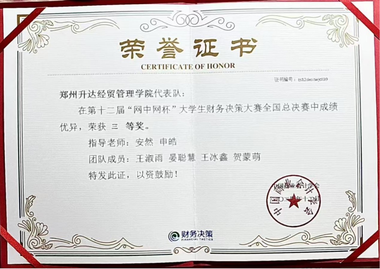 近日,由中国高等教育学会高等财经教育分会提供指导,中国商业会计学会主办的第十二届 “网中网杯” 大学生财务决策大赛全国总决赛在大理成功举办。大赛自10月启动以来,有近500所高校近千支代表队参赛,经过初赛、全国选拔赛的层层选拔,最终49支参赛代表队入围全国总决赛。我校会计学院2022级财务管理专业本科2班王淑雨、晏聪慧、王冰鑫、贺蒙萌四位同学在全国选拔赛中脱颖而出并顺利晋级,经过连续7个小时封闭式的激烈角逐,最终获得全国总决赛三等奖,指导老师安然、申皓获得“优秀指导教师”称号。