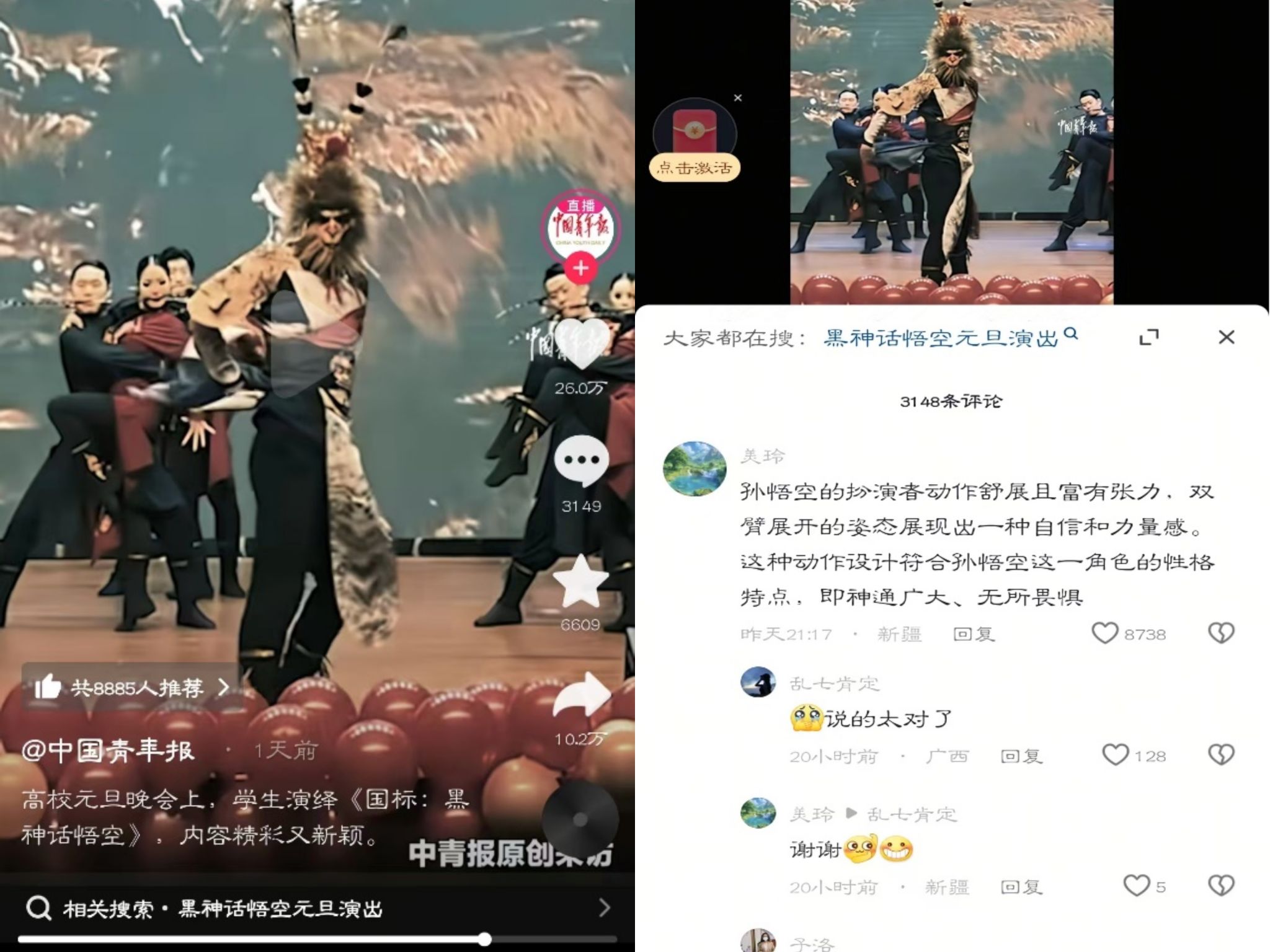 其中,由体育学院选送的舞蹈《黑神话悟空》出圈,中国青年报抖音号、河南省教育厅官方视频号、河南高教公众号等媒体竞相转发,抖音点赞达60余万次,热度破千万,冲入抖音郑州榜第二名。不少网友表示,“国标舞的优雅与动感,融入了悟空这一经典角色的元素,整个表演既具有现代感又不失文化底蕴”“孙悟空的扮演者动作舒展且富有张力,双臂展开的姿态展现出一种自信和力量感。这种动作设计符合孙悟空这一角色的性格特点,即神通广大、无所畏惧”。