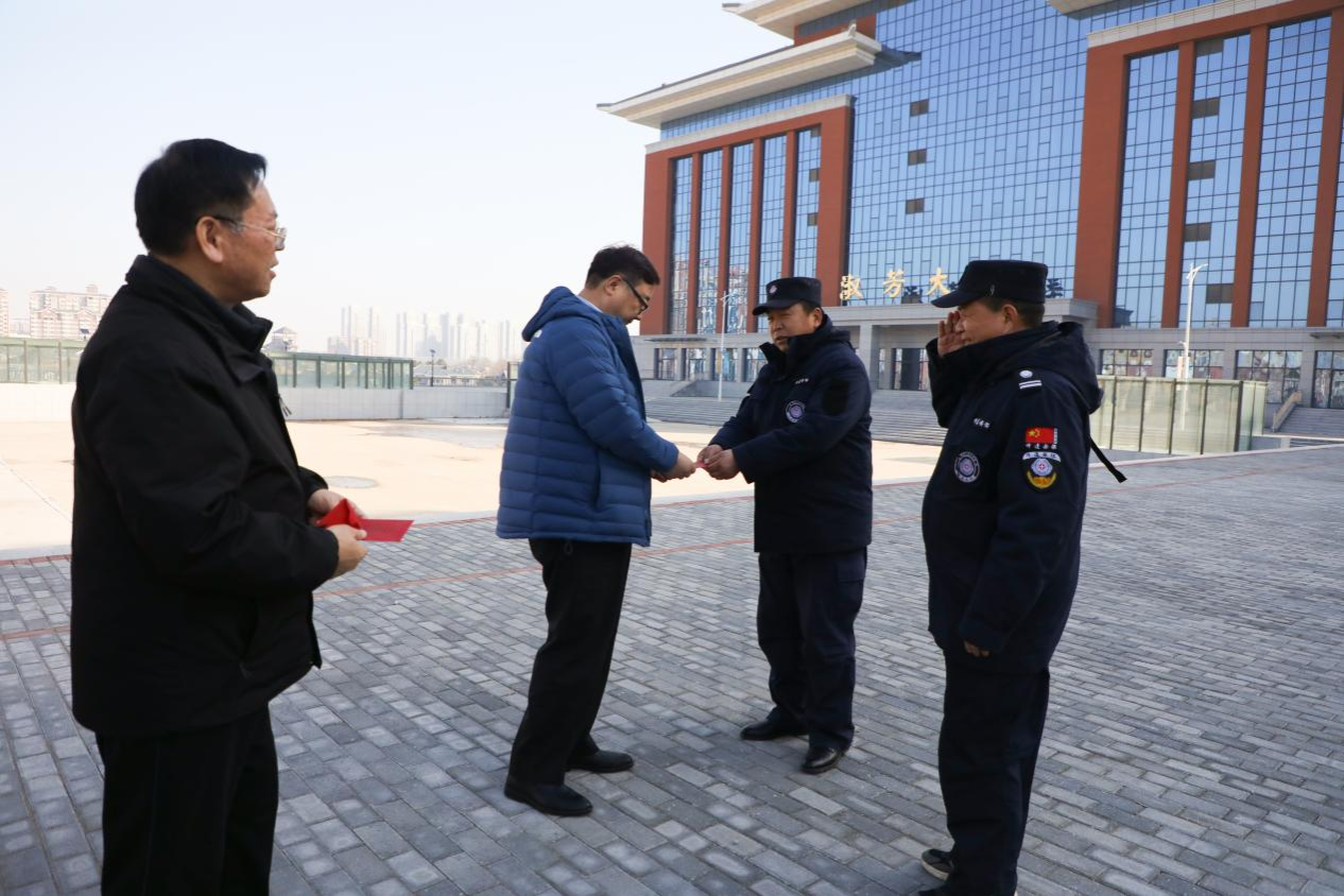 校领导一行带着新春问候和新年红包,先后到总值班室、保卫科、劳卫科、餐厅等值班场所走访慰问,详细了解节假日期间安全保卫和值班值守相关工作情况,每到一处,校领导都与值班人员亲切交谈,仔细询问春节期间值班人员工作、生活及后勤保障情况等,并送上新年红包。校领导对大家在春节期间放弃与家人团聚的机会,坚守工作岗位的奉献精神表示衷心的感谢和诚挚的敬意。