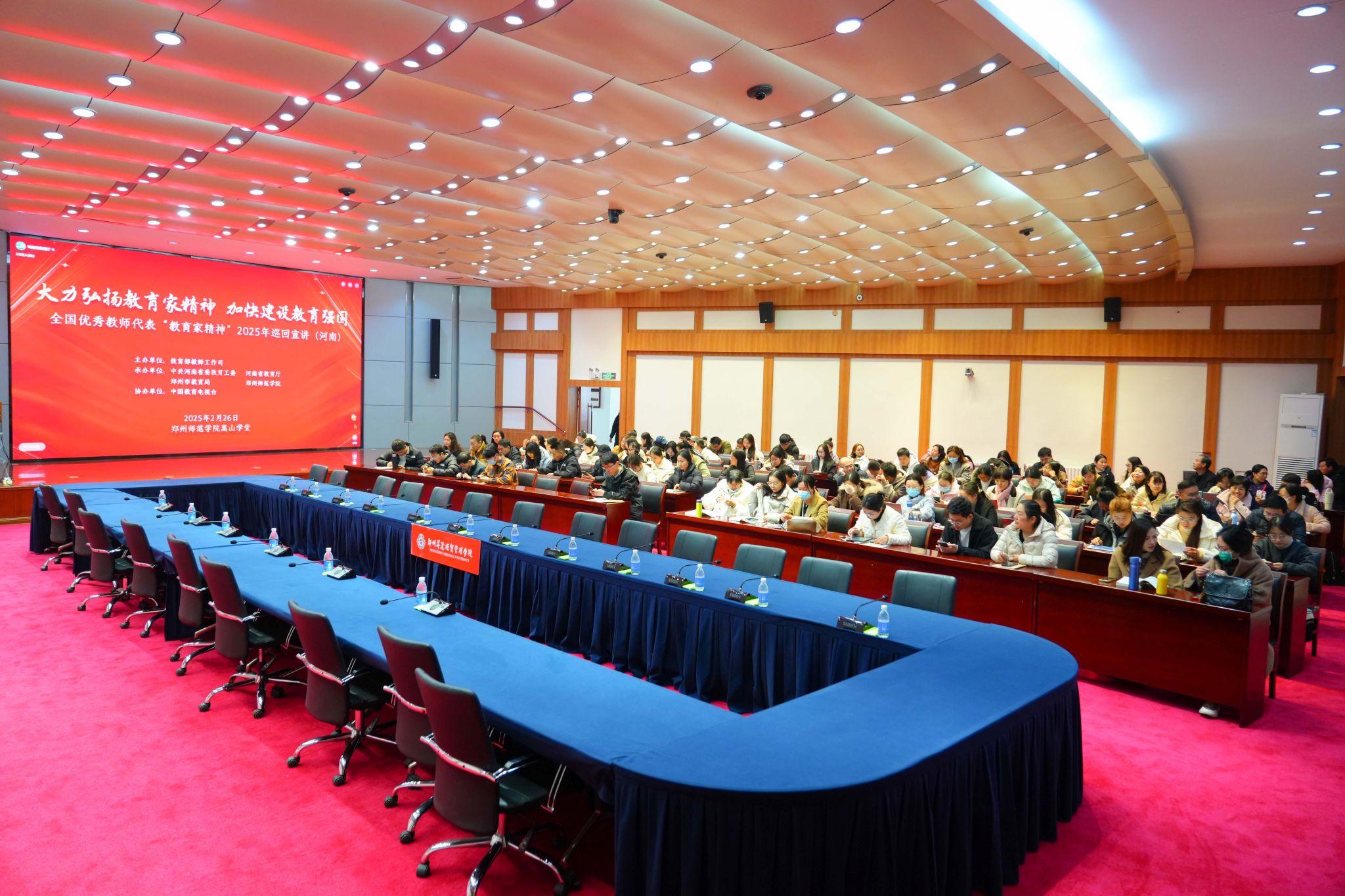 为深入贯彻落实习近平总书记关于大力弘扬教育家精神的重要指示,推进教育家精神铸魂强师行动,2月26日,我校在国际会议厅设立全国优秀教师代表“教育家精神”2025年巡回宣讲(河南)活动分会场,各二级学院教师代表学习观看。此次宣讲以“大力弘扬教育家精神,加快建设教育强国”为主题,邀请了来自全国各地的优秀教育工作者分享他们的教育实践与感悟,激励广大教师践行教育家精神,为教育强国建设贡献力量。