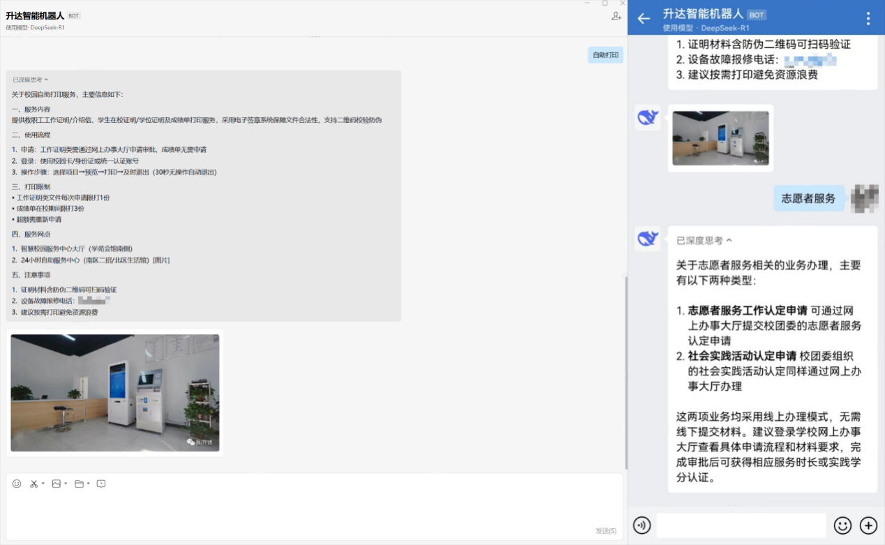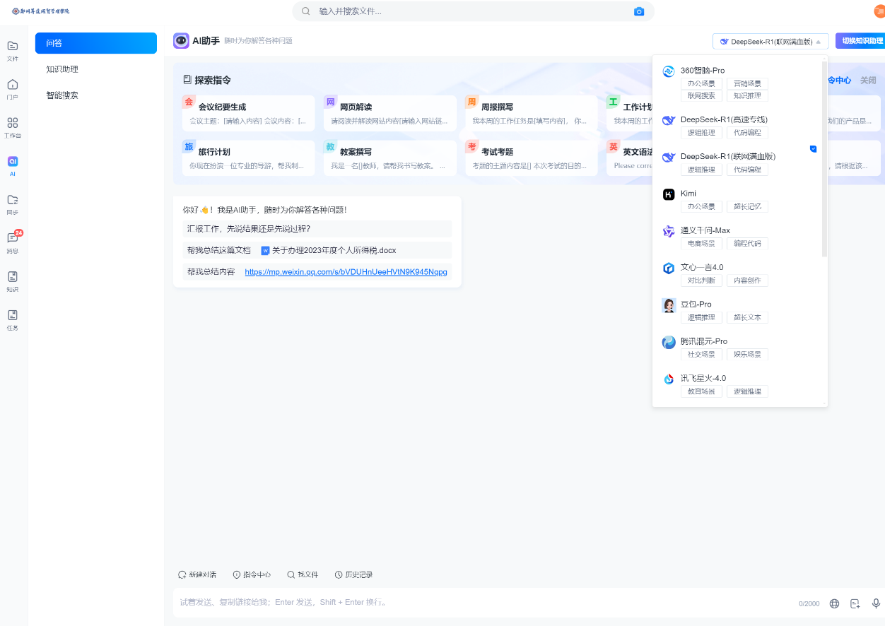 为响应国家教育数字化转型战略,我校积极推进接入DeepSeek的相关工作,目前已正式上线,同时学校作为CARSI联盟成员接入浙江大学满血版DeepSeek共享其资源服务;移动端基于企业微信通过“智能机器人”为师生提供咨询服务,以虚拟人的角色陪伴师生在校生活、解答各类问题;基于办公网盘接入包括DeepSeek、360智脑、Kimi、豆包、文心一言、通义千问等主流人工智能模型,服务场景更有针对性,全面赋能师生学习、办公场景;通过AI技术的深度应用,学校构建了高效、智能的教育教学生态,为智慧校园建设注入新的动力,未来我们将借助DeepSeek大模型的强大能力,逐步推进服务教学、科研、管理等全场景的智能化升级。
