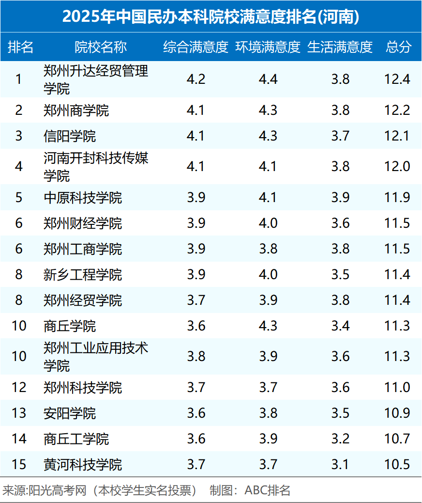 据悉“2025年河南省民办本科院校满意度排名”数据来源于中国高等教育学生信息网(学信网)“阳光高考网”,本校学生实名制对自己学校进行评价,ABC排名公众号制图发布。